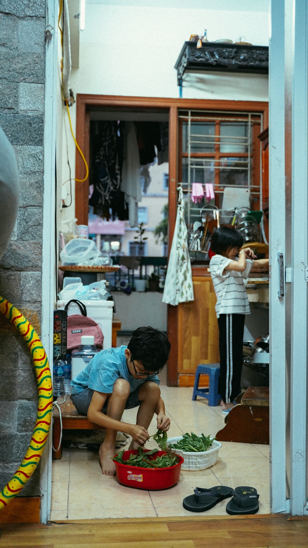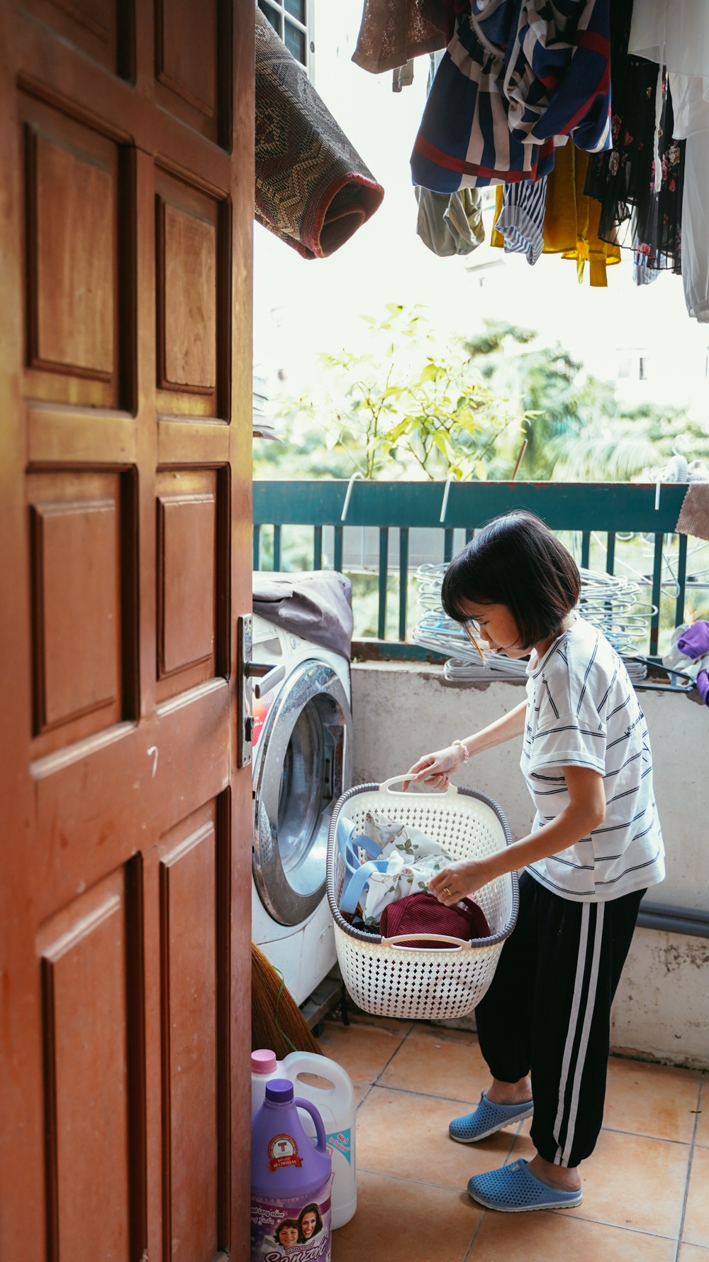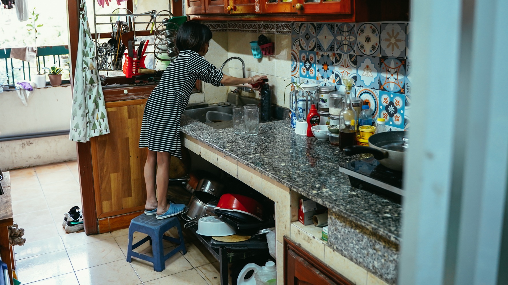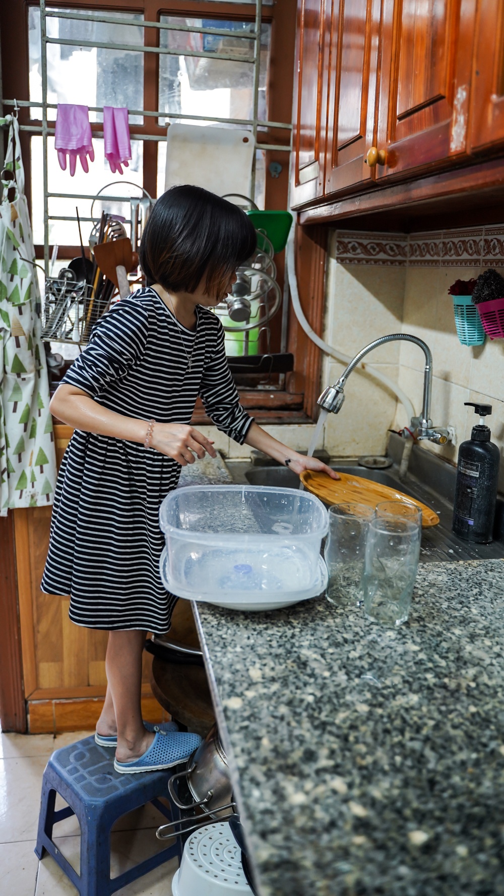 | Về đến nhà, vợ tôi tranh thủ dọn dẹp, giặt đồ. Không với tới bồn rửa nên cô ấy phải đứng trên chiếc ghế nhựa nhỏ. Tôi yêu thích những giây phút như thế này, khi chúng tôi chia sẻ với nhau việc nhà, trò chuyện về những điều diễn ra trong ngày. |