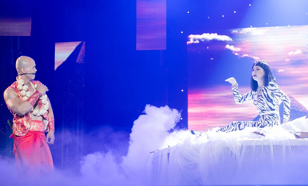 | “Cặp đôi hoàn hảo” Phan Đinh Tùng và Cát Phượng mang đến sự huyền bí của Ai Cập với tiết mục nhạc kịch Si Jangtung Hati – một bài hát của Indonesia. Cả hai gây ấn tượng với tạo hình lạ mắt của mình. Nữ diễn viên hài hóa thân thành nàng Anck-su-namun xinh đẹp. |