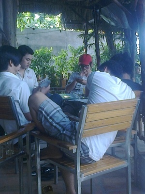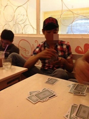 Cả nhóm bắt đầu vào sòng, ba bộ bài mới cứng được lấy từ trong cặp T. ra. “Như cũ, năm - mười nhá (nhất 100.000 đồng, nhì 50.000 đồng). T. nói về thể lệ tiền, Hải và H. đồng thanh “ok”.