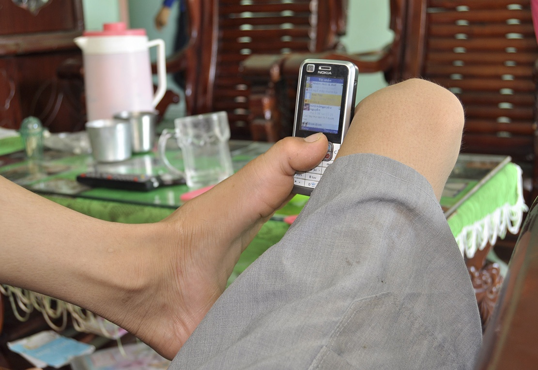 Ngón chân của chàng học trò làm được những động tác khó như bấm bàn phím máy tính, bấm số trên thiết bị điều khiển tivi.