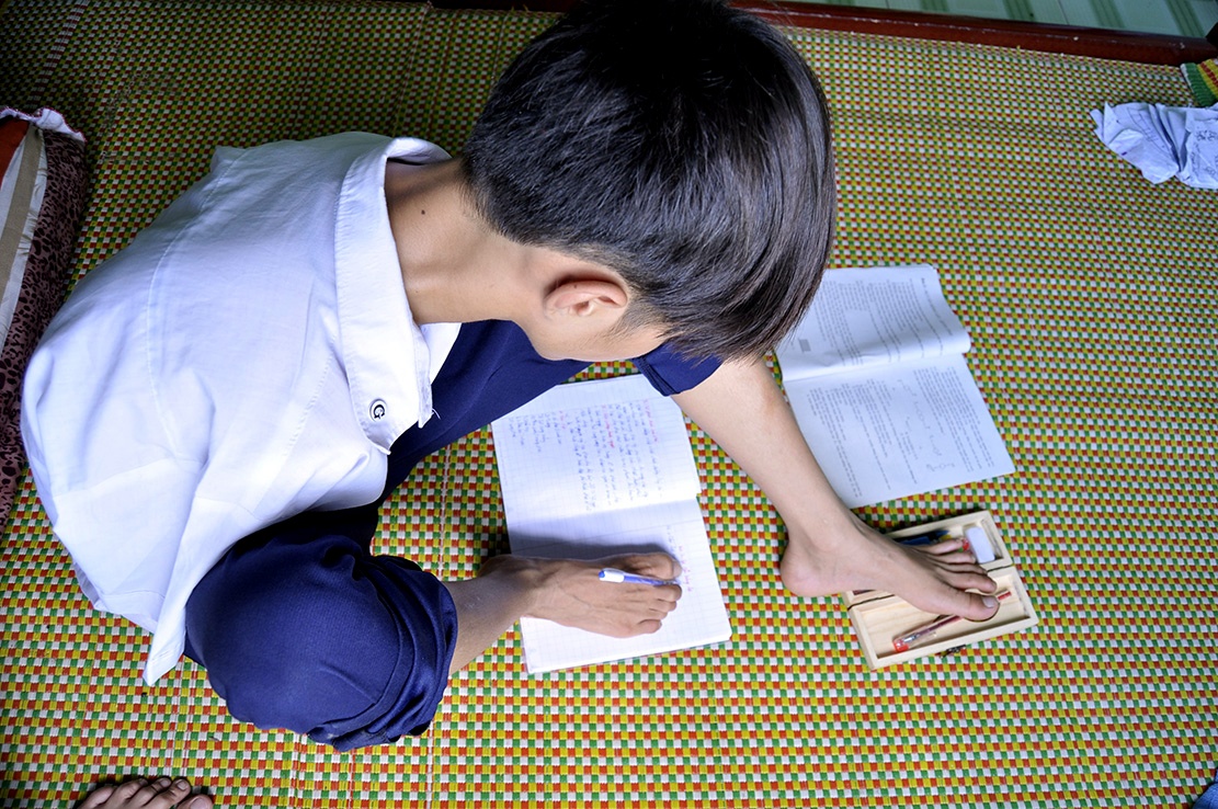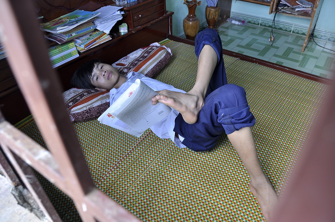 Tuy nhiên, lên 3 tuổi, cậu bé đã có thể dùng chân cầm nắm được những vật nhỏ như lược chải tóc, đồ chơi... "Đến 6 tuổi, tôi đưa Hạnh đến trường, xin nhập học nhưng các giáo viên từ chối vì cho rằng em không có khả năng viết chữ", bố cậu bé kể.