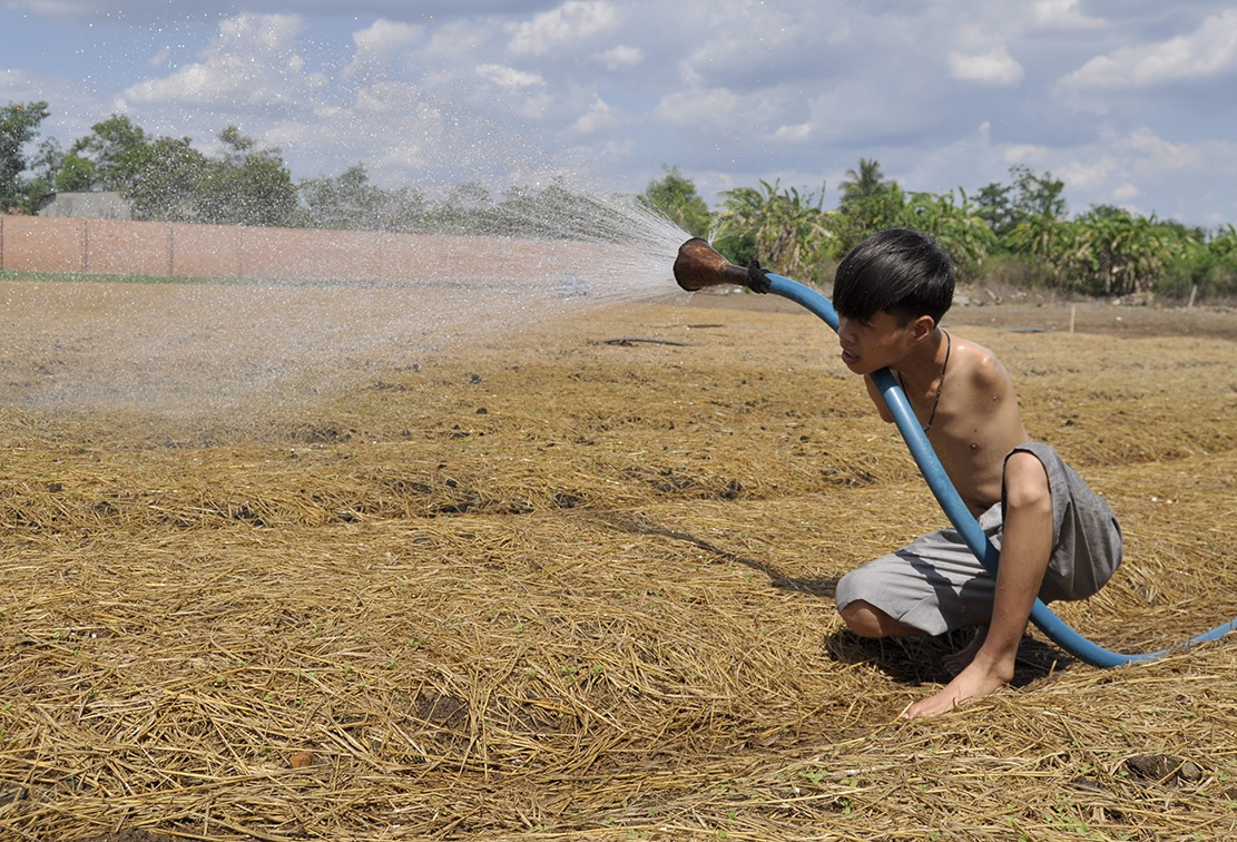 | Hạnh dùng cằm và vai kẹp ống nước tưới vườn phụ giúp cha mẹ. |