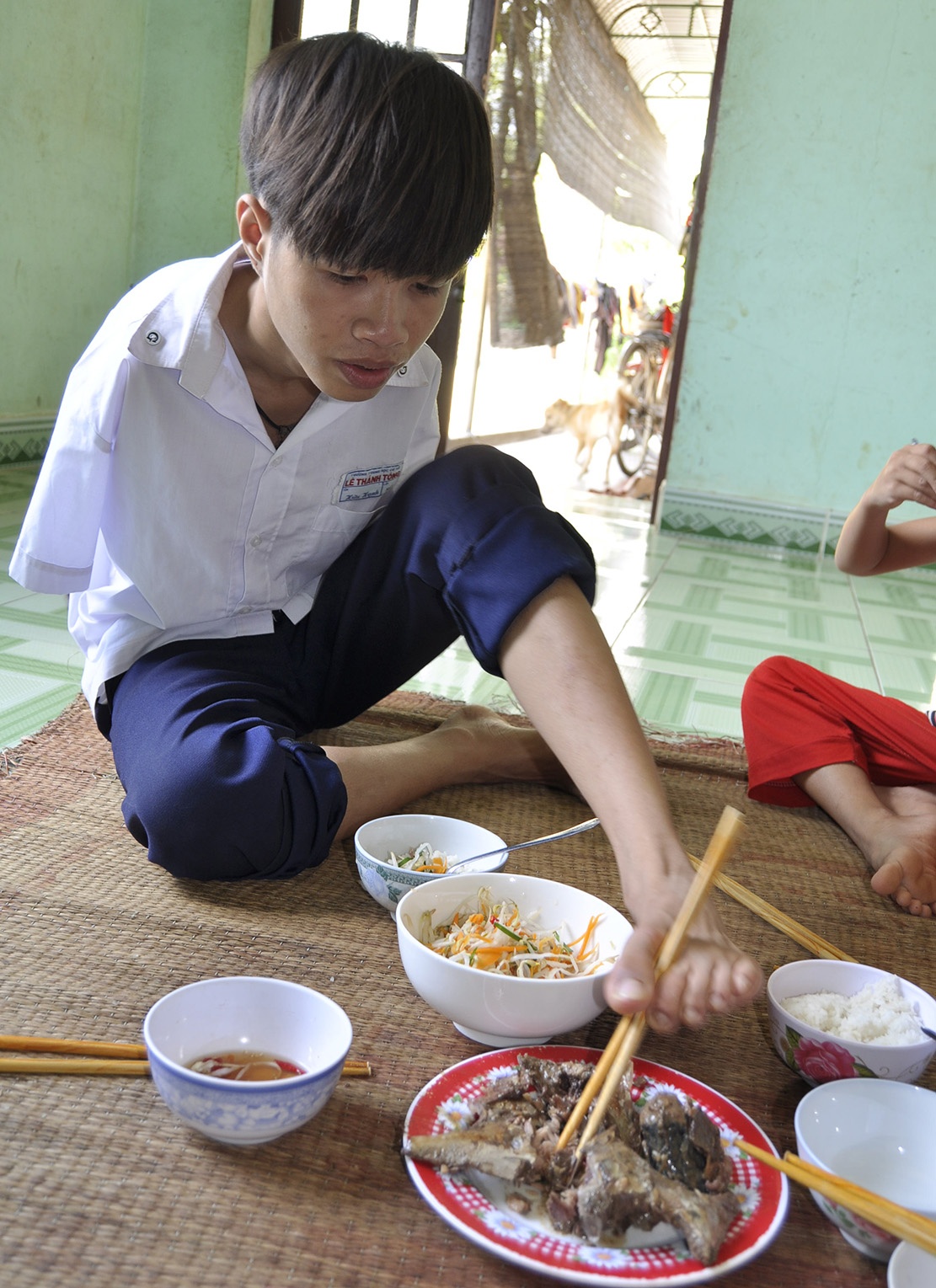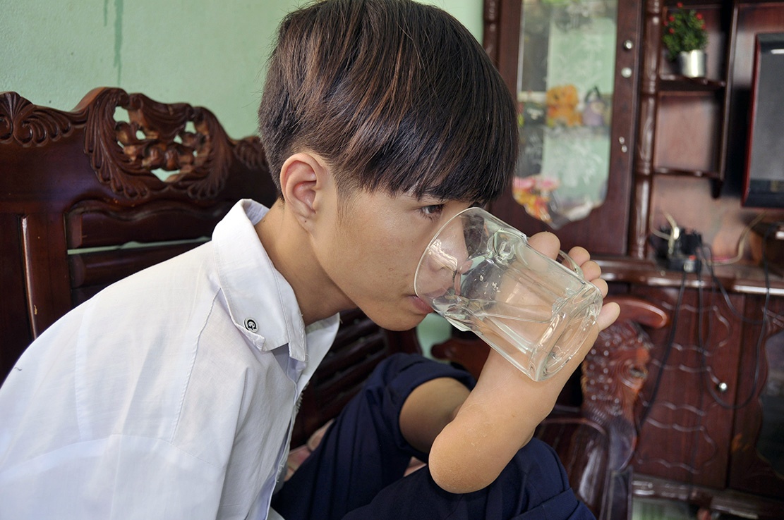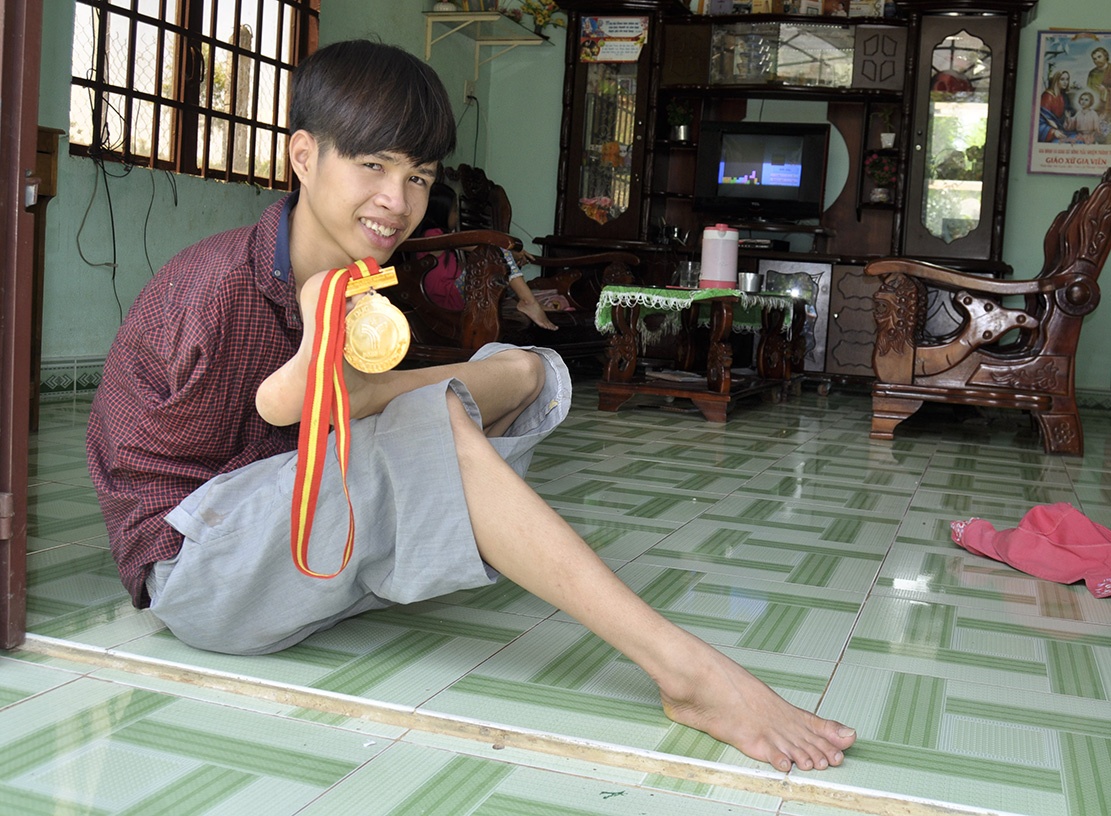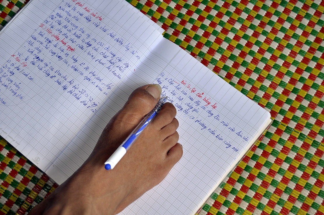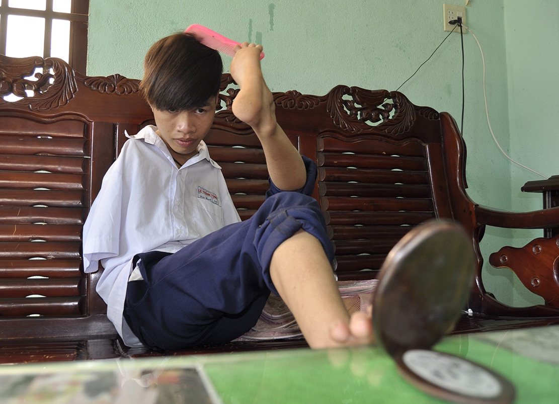 | Hồ Hữu Hạnh (16 tuổi, ngụ xã Gia Canh, huyện Định Quán, Đồng Nai) khuyết tật bẩm sinh, không tay. Tuy nhiên, với đôi chân dẻo dai, cậu có thể cầm nắm mọi vật dụng, làm việc như người bình thường. |