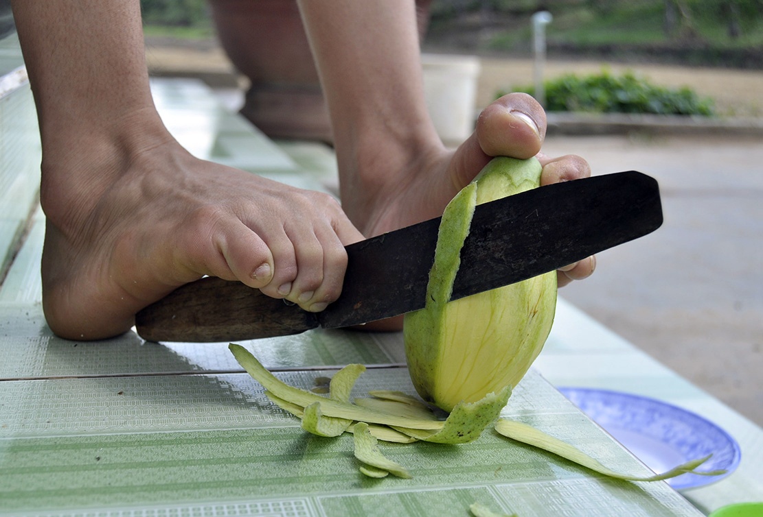 Chàng trai không tay cho biết, ngoài việc gọt hoa quả, em có thể dùng chân cầm dao chặt cây, phát quang bụi rậm.