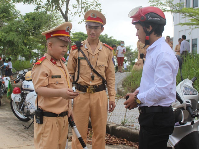 | Tuấn Dũng được hướng dẫn kiểm tra giấy tờ người vi phạm giao thông. Ảnh: B. Vân. |