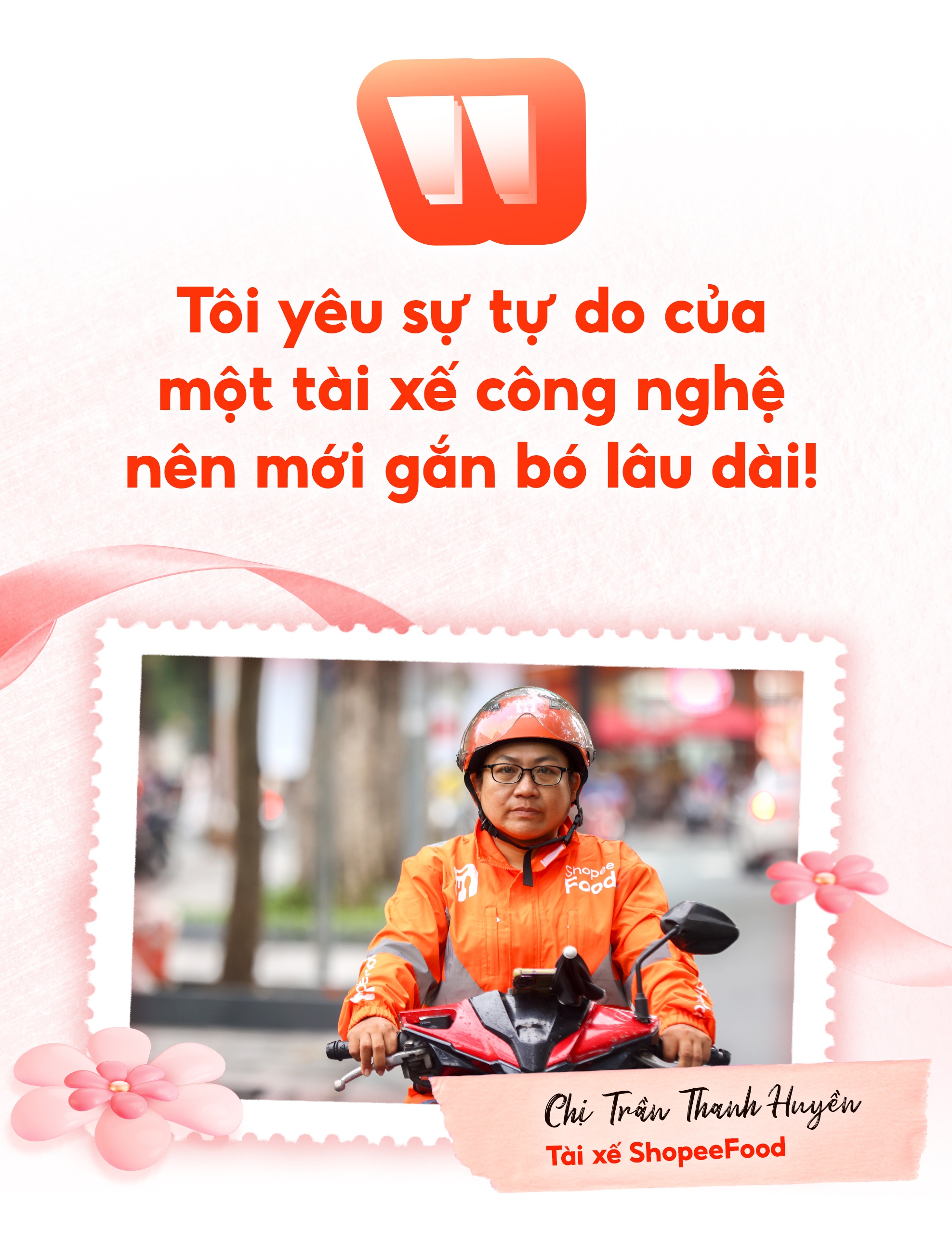 Giống chị Thùy Linh và chị Mỹ Linh, chị Trần Thanh Huyền (TP.HCM) cũng từng có thuở đầu e dè, nhưng vẫn lựa chọn đồng hành và gắn bó với ShopeeFood suốt 5 năm qua. Chị cho biết: “Nhiều người hỏi tôi sao không thử chọn một công việc nào khác mà ít phải di chuyển thường xuyên ngoài đường để đỡ cực hơn. Tôi chỉ đáp mỗi nghề có điểm lợi và bất lợi riêng mà phải làm mới biết. Quan trọng là tôi yêu sự tự do của một tài xế công nghệ nên mới gắn bó lâu dài”.