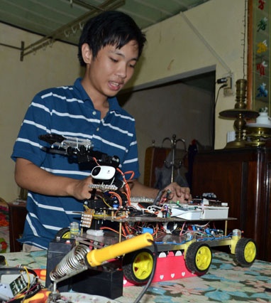 | Ngô Huỳnh Ngọc Khánh và robot K-Bot điều khiển bằng sóng wifi do Khánh chế tạo. |