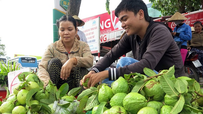 | Hạng phụ mẹ bán ổi ở cổng chợ. Ảnh: Tuổi Trẻ. |