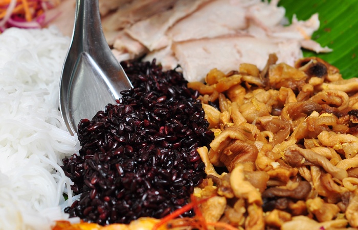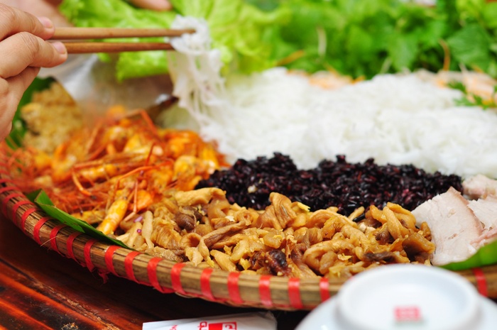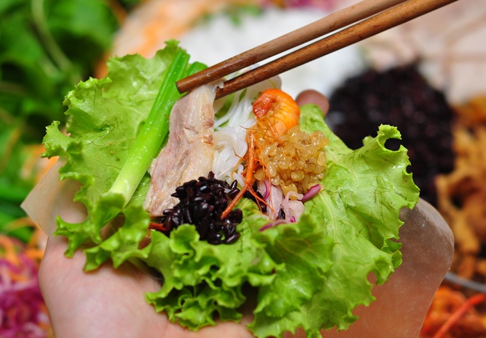Một mẹt cuốn có tới chục vị. Điều đặc biệt là ngoài tôm, thịt, rau sống… quen thuộc thì trên mẹt có cả nếp trắng, nếp cẩm mà chủ quán gọi chung là cơm rượu – thứ nguyên liệu dường như… chẳng liên quan. “Nhưng đây là kiểu ăn của các cụ ngày xưa đấy!”, anh chủ nhà hàng giải thích.