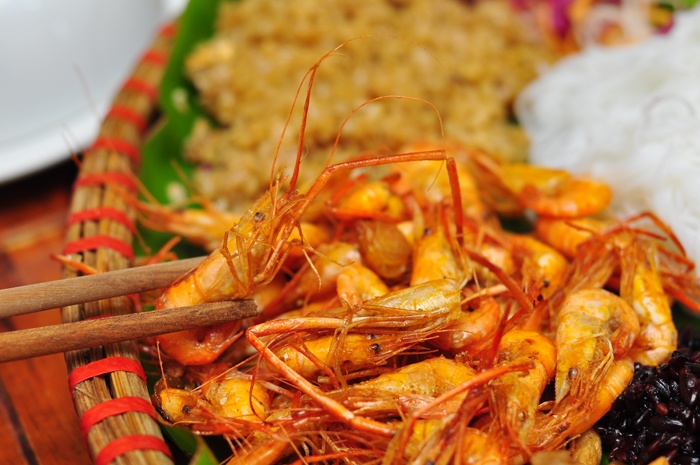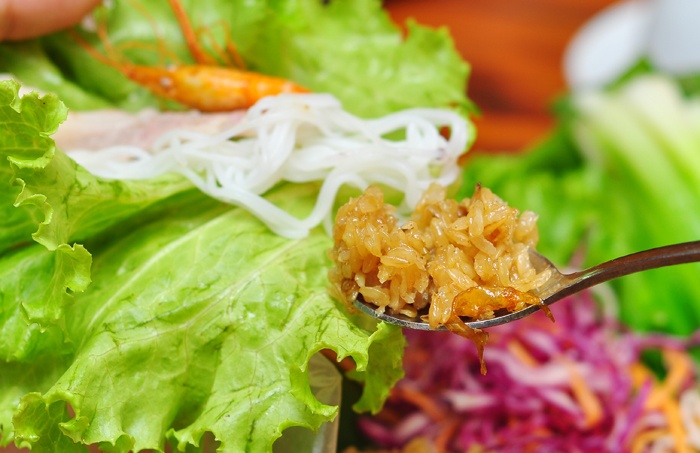 Tất nhiên, cơm rượu chỉ là nguyên liệu phụ có yếu tố lạ. Tôm, thịt, nước mắm chấm vẫn là “cái hồn” của món ăn. Tôm chọn đúng loại tôm sông, đỏ au, càng dài, tuy nhỏ nhưng vỏ mềm rang lên rất bùi. Thịt ba chỉ khá nạc chứ không bèo nhèo mỡ làm khách ớn ngấy. Nước mắm của quán chưa đặc sắc nhưng pha vừa miệng. Rau củ thì phong phú, ngoài các loại rau sống phổ biến còn có củ cải dầm rất giòn, khách nhón ăn dỗ mồi cũng thấy ngon, thấy thích.