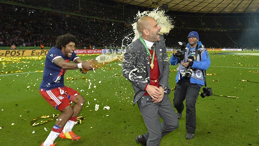 | Học trò tắm bia cho Pep Guardiola mừng mùa giải 2013/14 với 2 danh hiệu. |