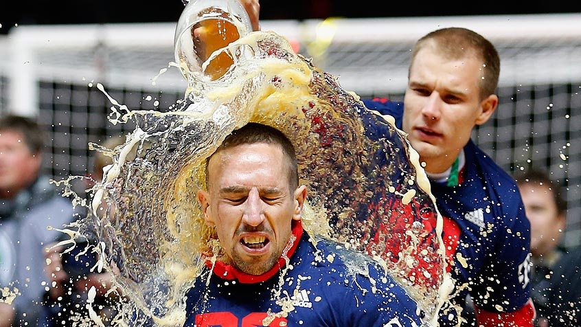 | Các cầu thủ Bayern tắm bia cho nhau ăn mừng chiến thắng trước Dortmund. |