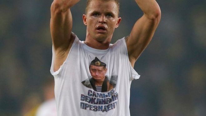 Rạng sáng 17/2, khi trận đấu giữa Fenerbahce và Lokomotiv Moscow trong khuôn khổ Europa League kết thúc, cầu thủ Dmitri Tarasov trong lúc đến vỗ tay cảm ơn các fan từ nước Nga đã để lộ chiếc áo thun có in hình Tổng thống Vladimir Putin mặc trang phục quân sự, bên dưới có dòng chữ “Vị chính khách lịch thiệp nhất”.