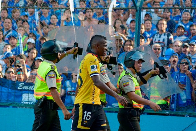 | Alex Bolanos phải rời sân dưới sự bảo vệ của các nhân viên an ninh. Ảnh: Prensa Sport |