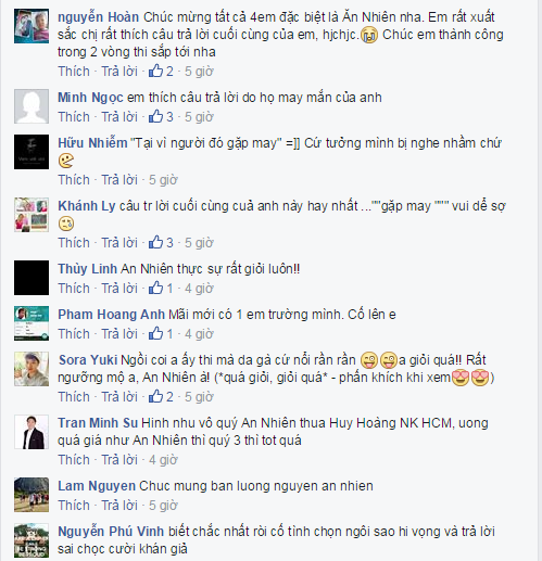 | Nhiều bình luận chúc mừng An Nhiên dành chiến thắng cuộc thi tháng và bàn luận về xâu trả lời hài hước của anh. Ảnh: Chụp màn hình. |