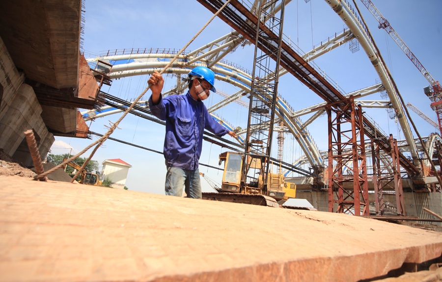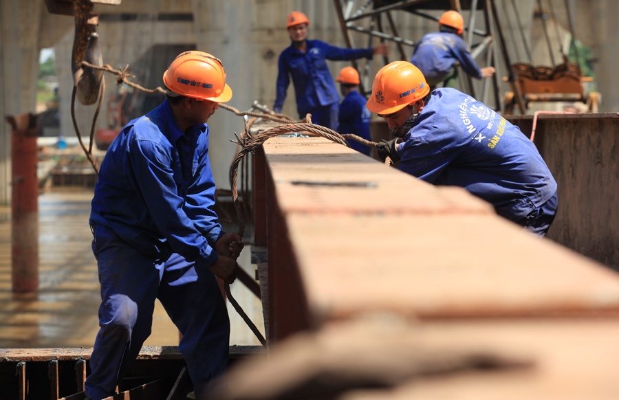 Từ tháng 4/2013, toàn bộ lực lượng kỹ sư, công nhân tinh nhuệ nhất của các Xí nghiệp Cầu 17, Cầu 18, Công ty Thi công cơ giới với 1500 người liên tục thi công 3 ca/ngày để đảm bảo tiến độ.