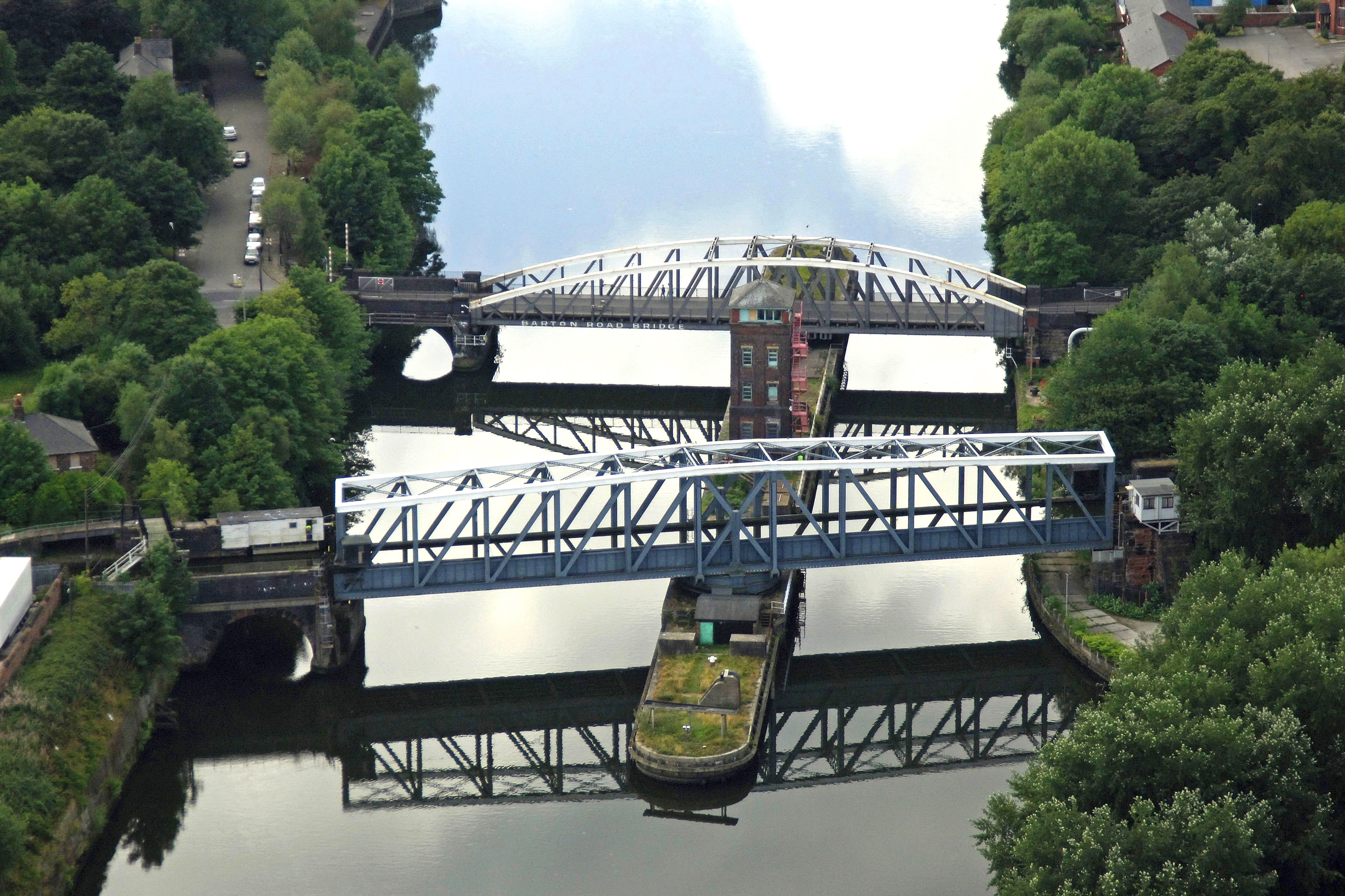 Cây cầu này nặng 1.450 tấn và dài 100 m. Thiết kế đặc biệt của cầu cho phép các thuyền di chuyển từ vùng Barton ra sông Irwell. Khi các tàu lớn đi qua, Barton Swing sẽ quay theo góc 90 độ một cách ngoạn mục. Ảnh: Martin Zero. |