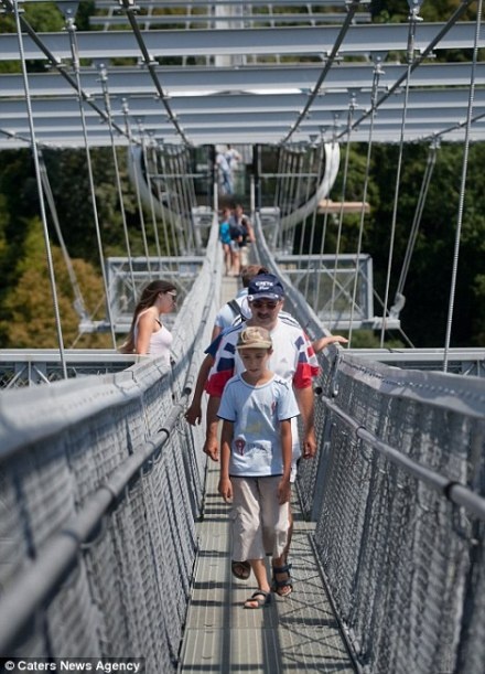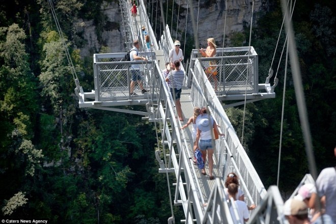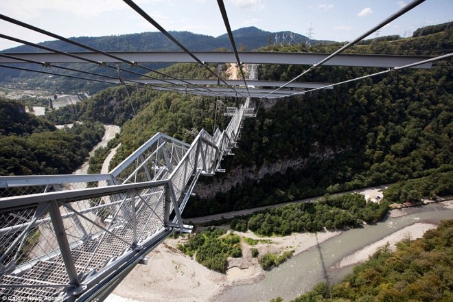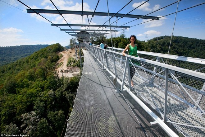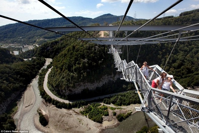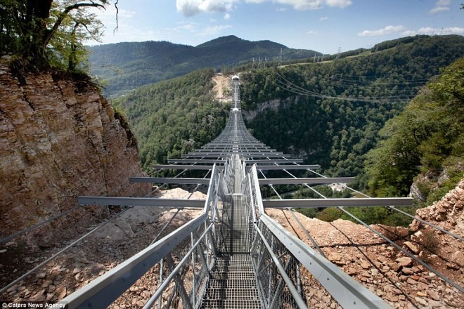 | Cây cầu này bắc qua thung lũng Krasnaya Pollyanna có chiều dài khoảng 550 m và cao đến 198 m được xây dựng cho người đi bộ. |