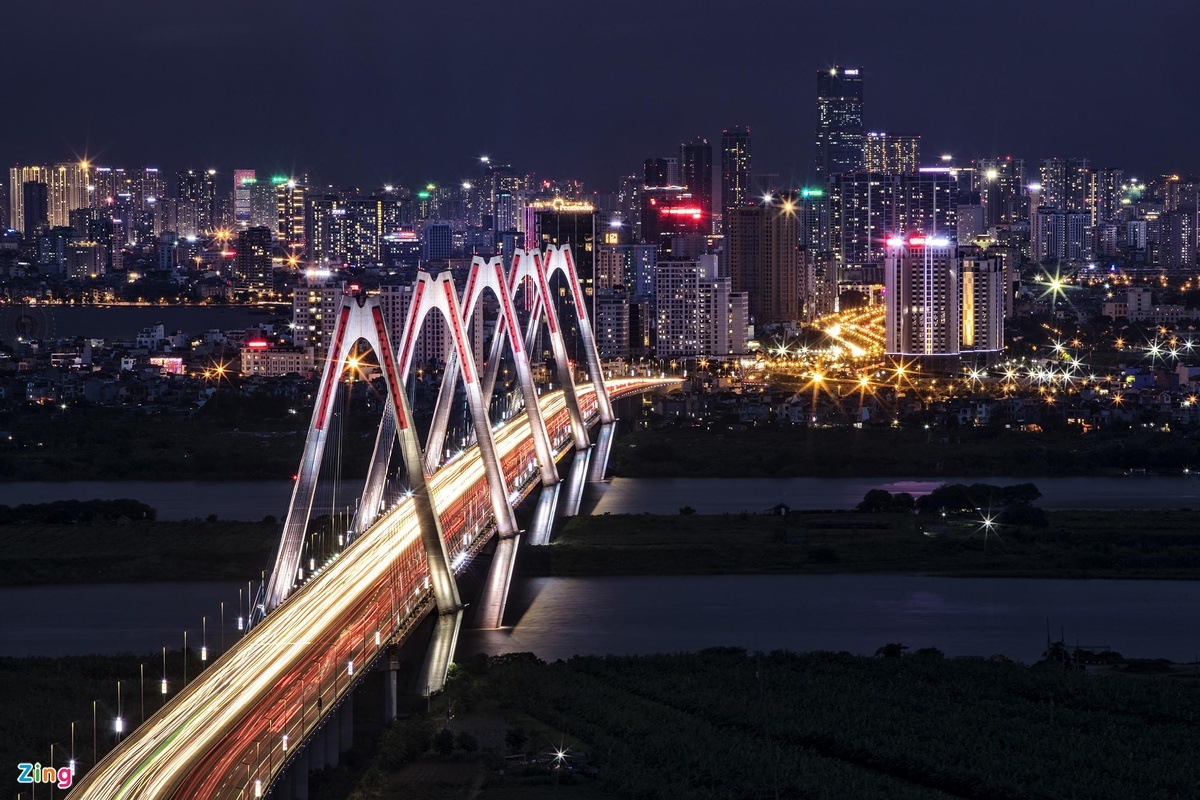 Nhật Tân, cây cầu dây văng dài nhất Việt Nam, bắc qua sông Hồng đoạn Hà Nội, nối quận Tây Hồ với huyện Đông Anh. Cầu Nhật Tân và đường hai đầu cầu có tổng chiều dài 8,93 km với quy mô 8 làn xe chạy. Đây cũng là một trong số ít cầu dây văng liên tục nhiều nhịp trên thế giới. Ảnh: Vũ Minh Quân. |