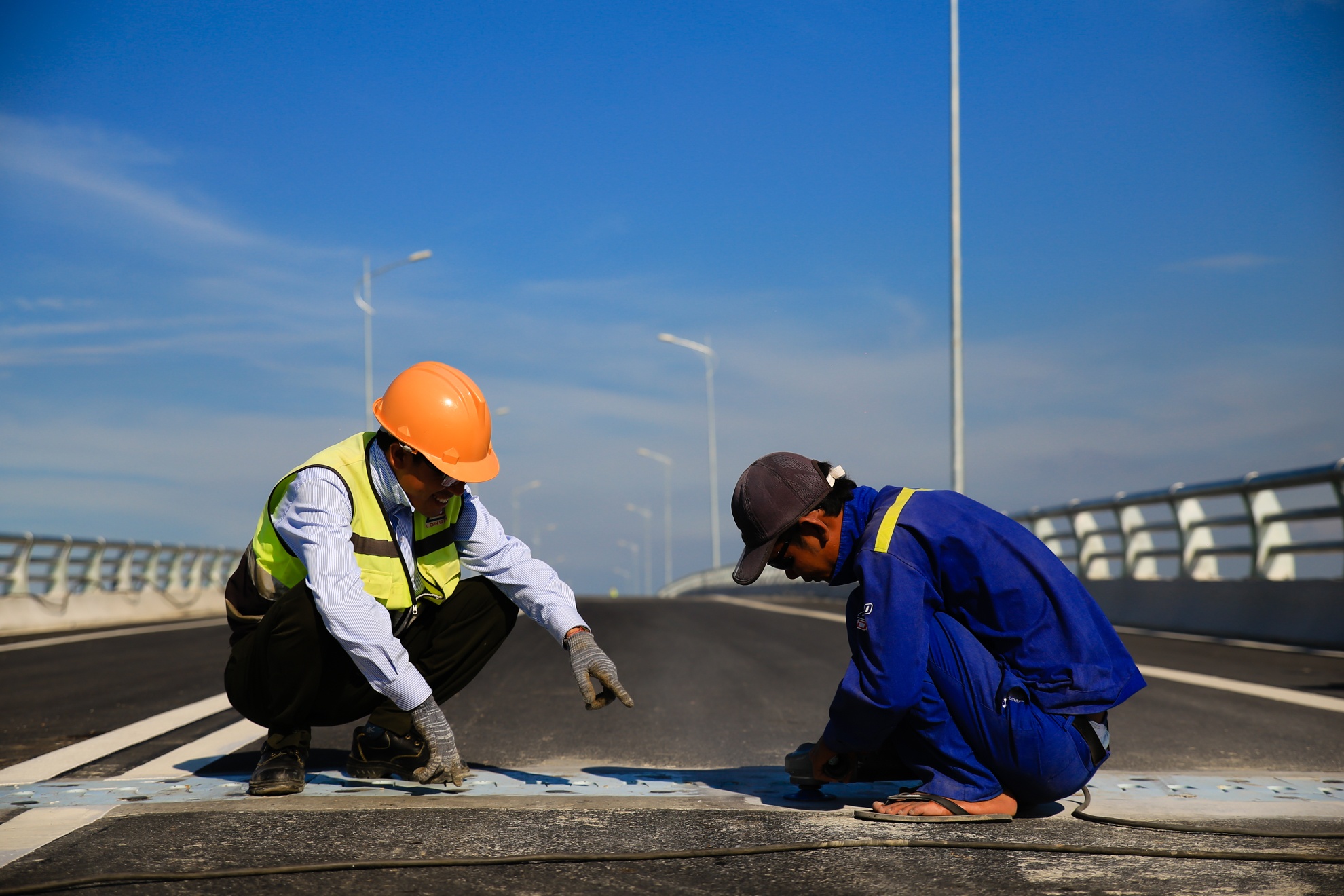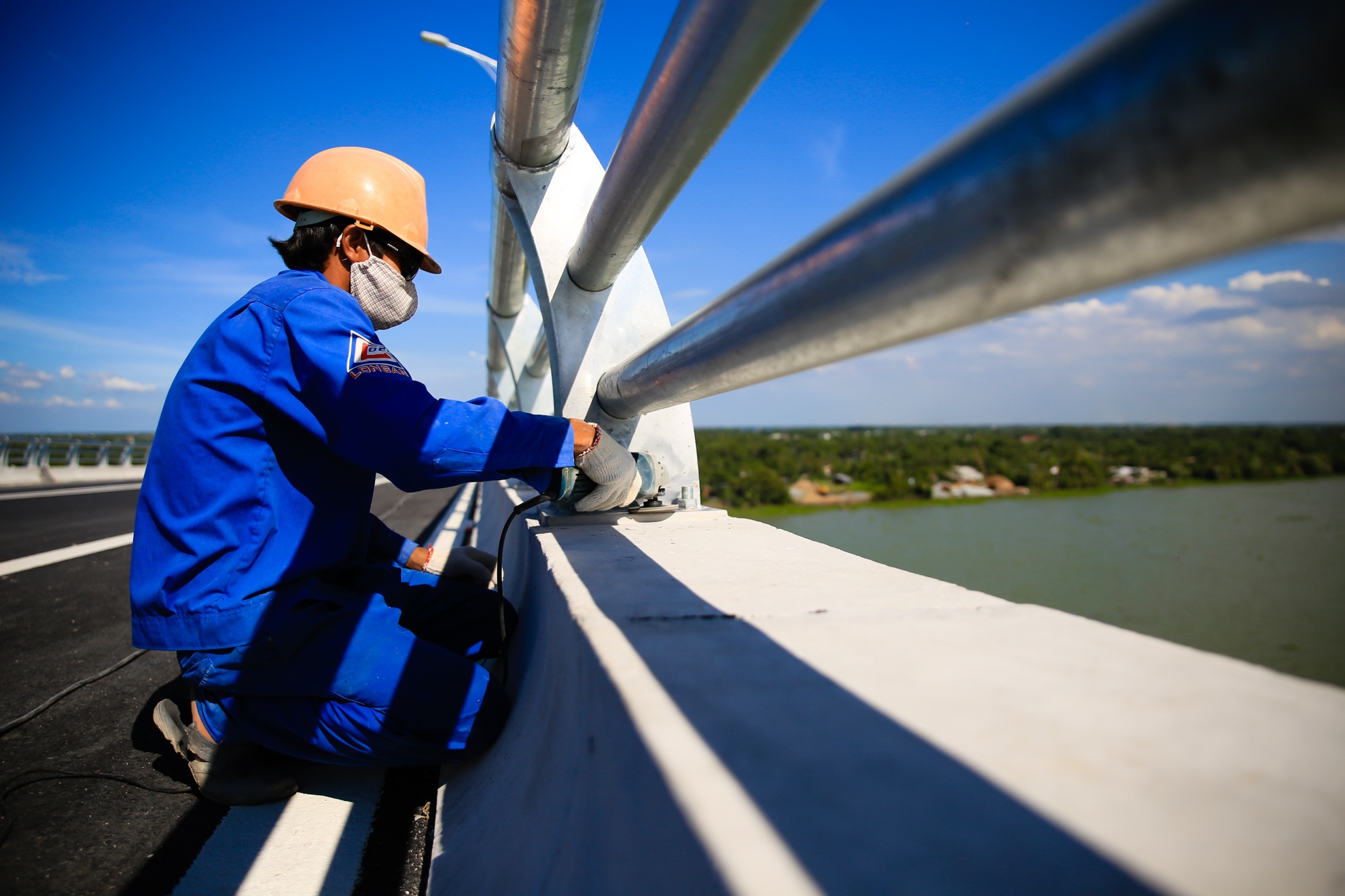 Trước ngày thông xe cầu Mỹ Lợi, công nhân dọn vệ sinh, hoàn tất khâu chuẩn bị. Từ nay, quãng đường 100 km từ TP HCM về Tiền Giang rút ngắn còn một phần tư.