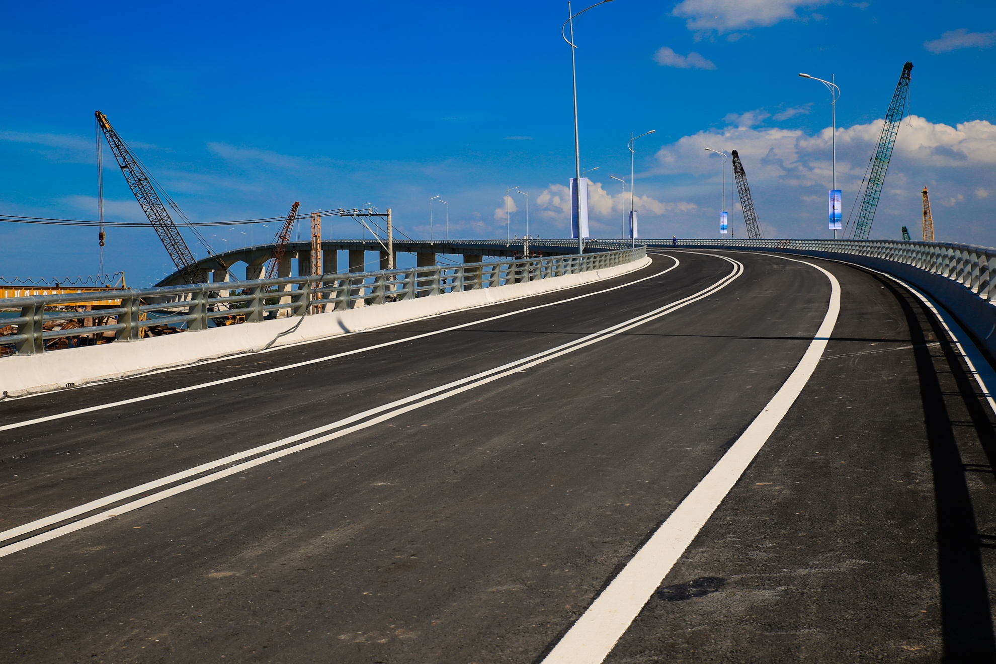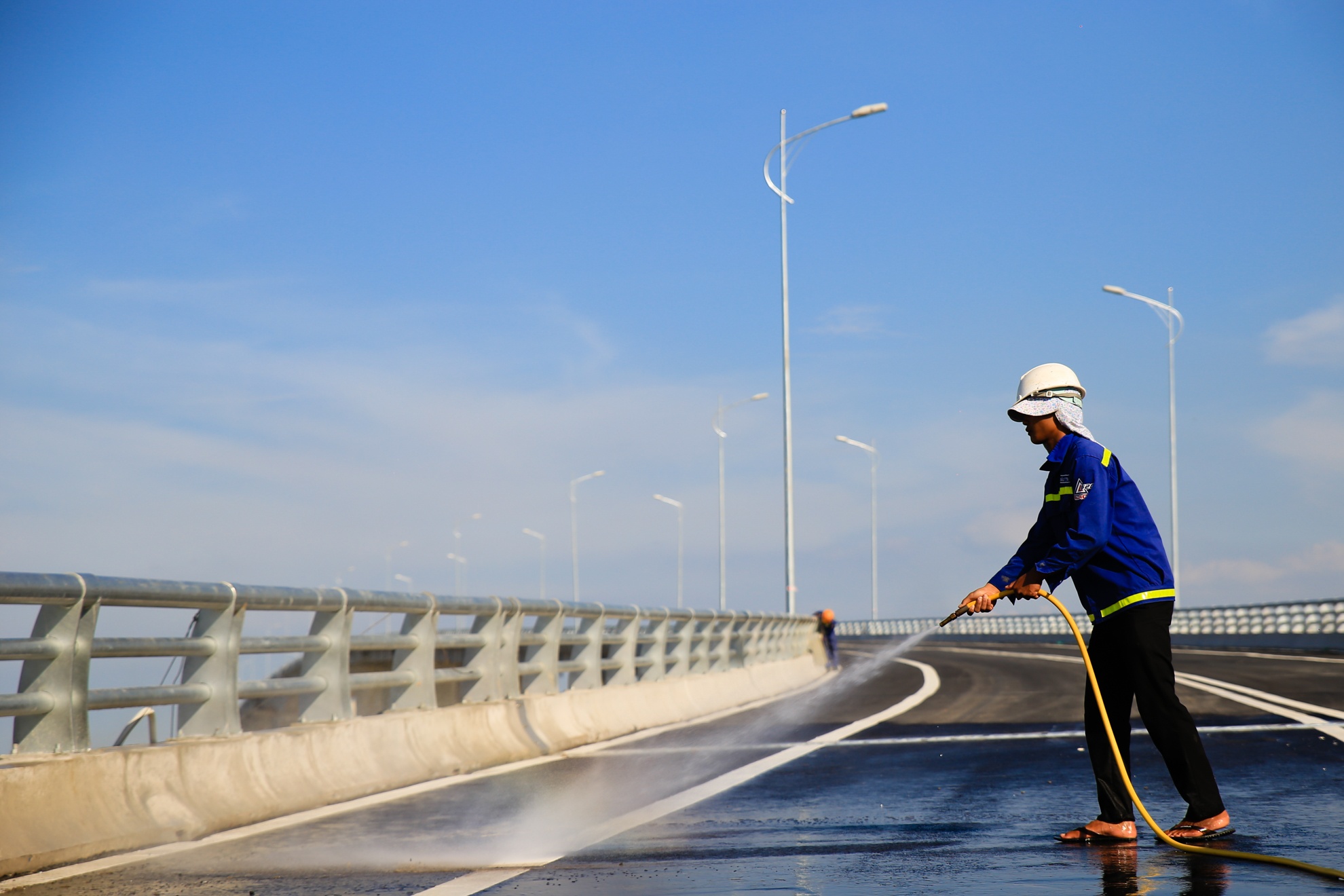 | Công nhân rửa dọn mặt cầu sạch sẽ cho ngày lễ thông xe sắp diễn ra. |