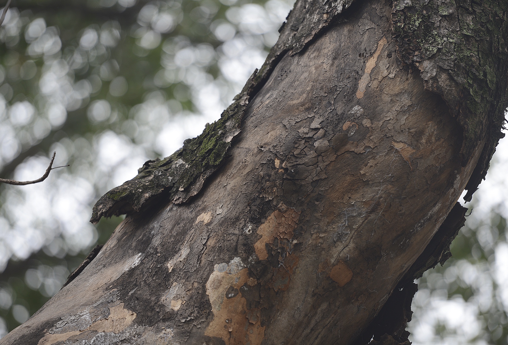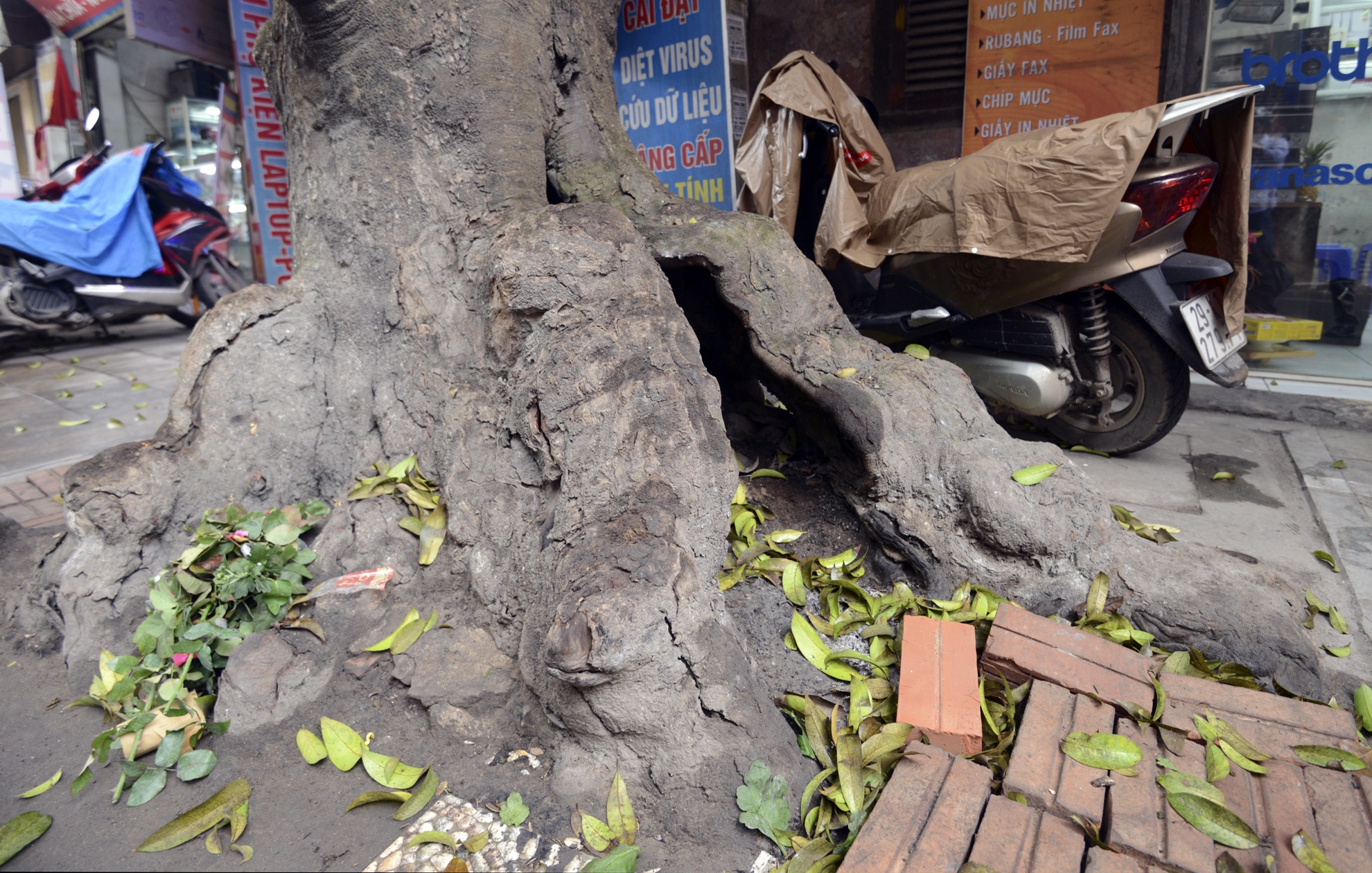 Phần gốc của một cây sấu chồi lên so với vỉa hè, thậm chí mục ruỗng bên trong.