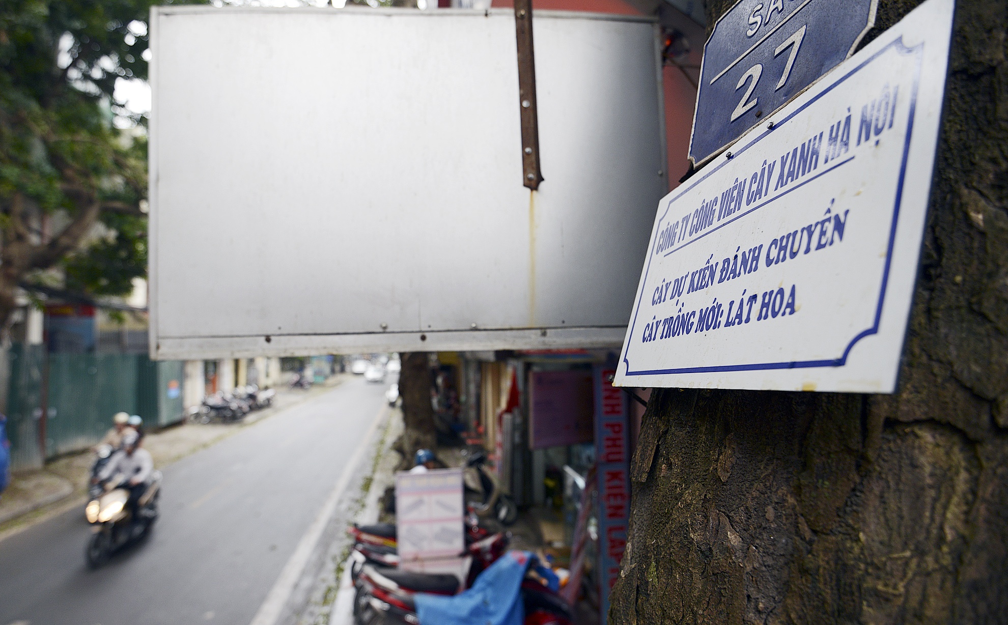 Công ty TNHH một thành viên cây xanh Hà Nội vừa treo 70 tấm biển trưng cầu ý kiến người dân về việc chuẩn bị thay thế cây trên đường Trịnh Hoài Đức, Trần Phú, Lý Nam Đế. Biển được đặt ở vị trí cao hơn đầu người, kích thước 30x20 cm, chất liệu bằng tôn, ghi rõ “Cây dự kiến đánh chuyển, cây trồng mới”.