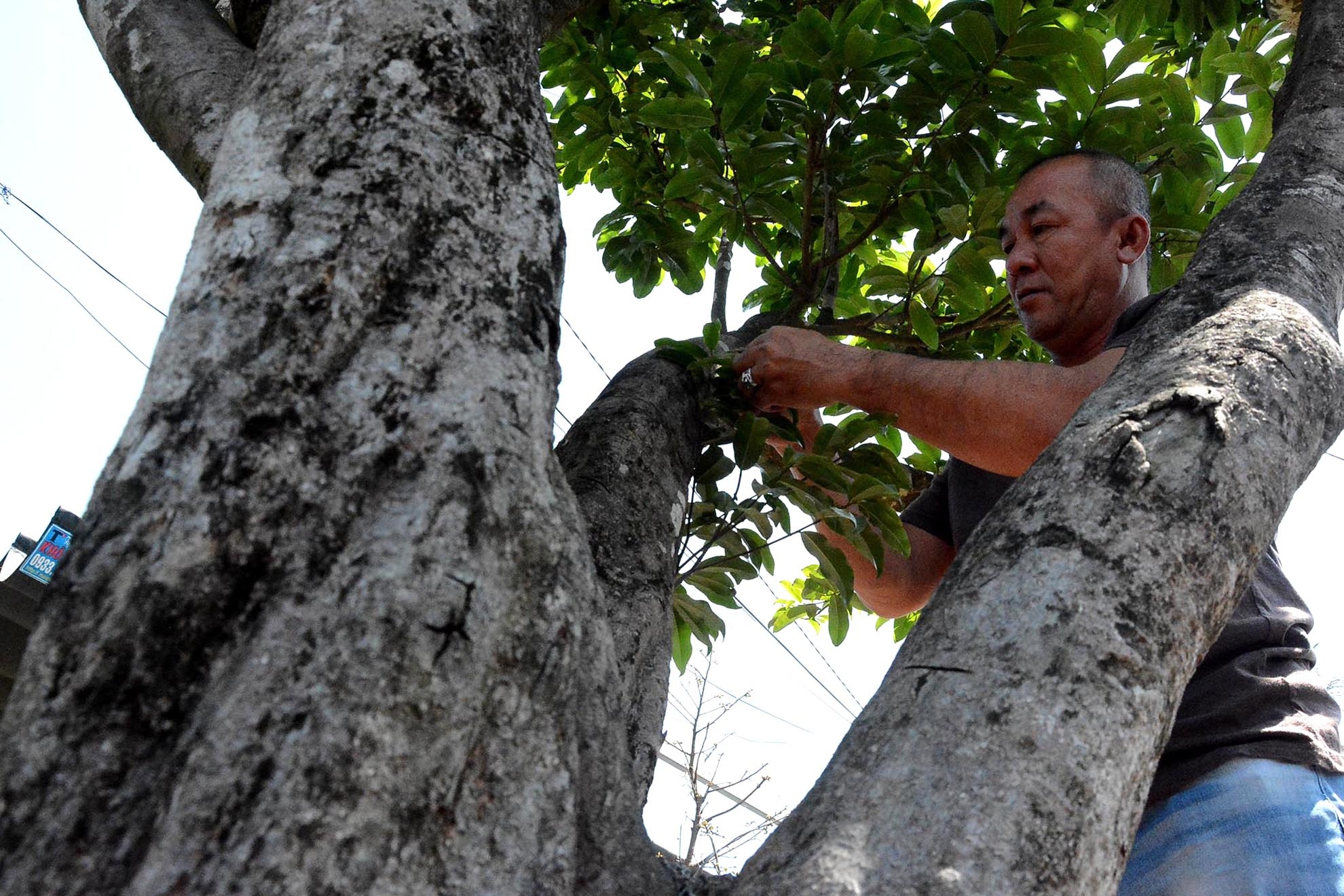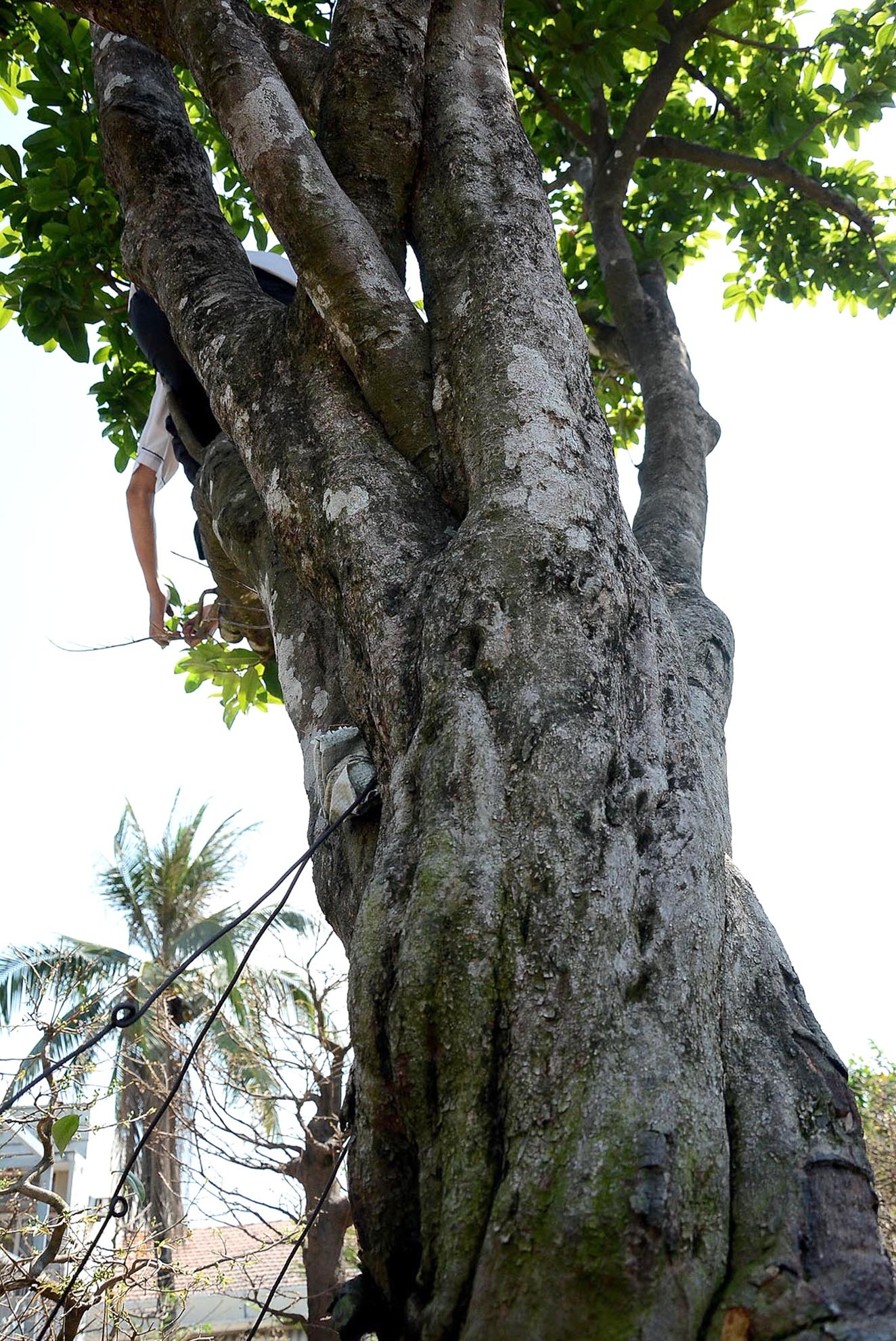 | Để lặt lá cho lão mai trăm tuổi, có đến 3 thợ trèo lên cành làm việc cả ngày. Ông Hoà cho biết dù mai đã cao tuổi nhưng vẫn còn khoẻ mạnh, tươi tốt. |