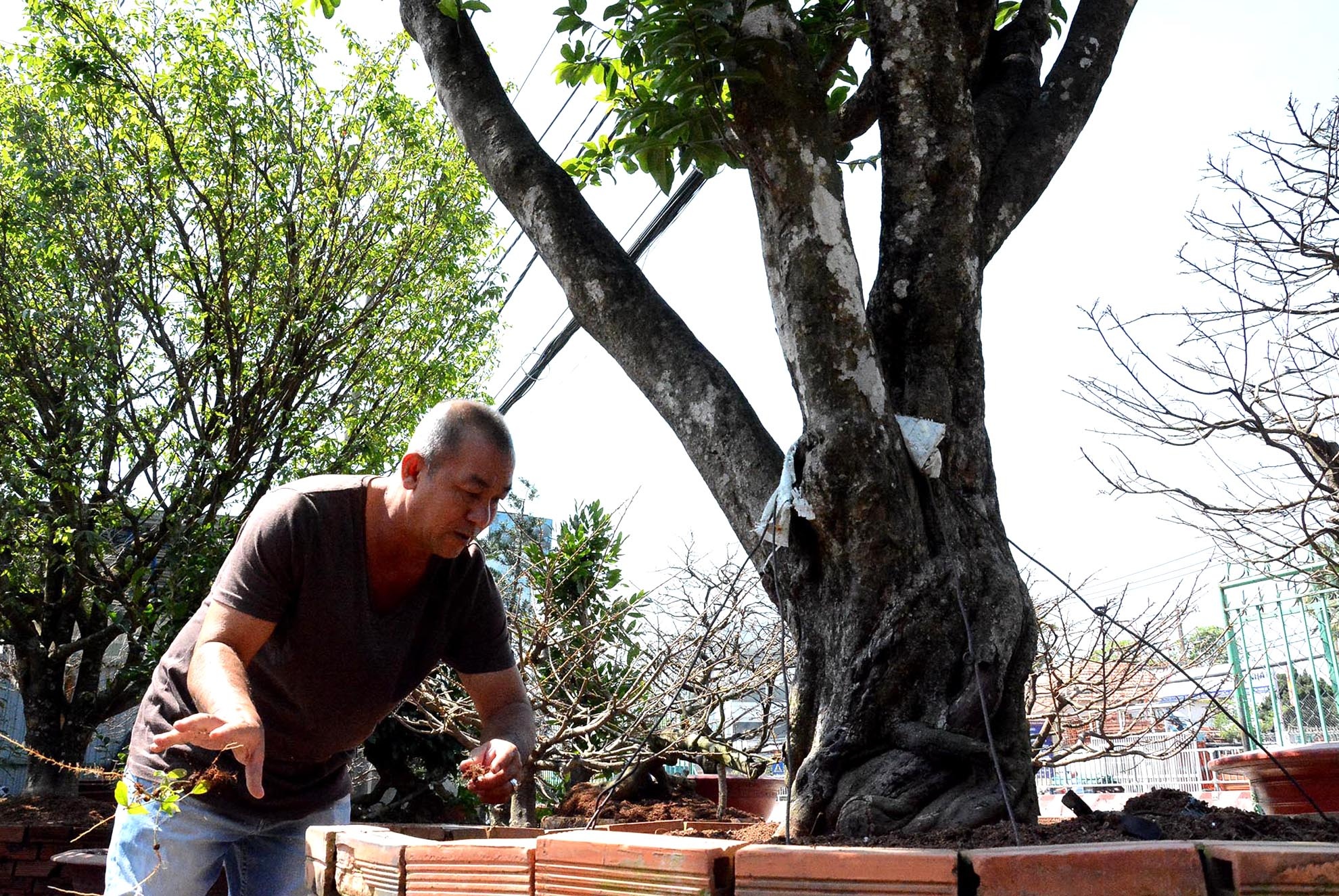 | Ông Giang Kiến Hòa, nghệ nhân gắn bó hơn 20 năm với nghề trồng mai ở phường Hiệp Bình Phước, quận Thủ Đức, TP HCM, cho biết: “Tôi săn mai cổ thụ này ở Đồng Nai nhiều năm trước. Ban đầu nhìn gốc mai có dáng và gốc rất hoàn hảo nên quyết định mua”. |