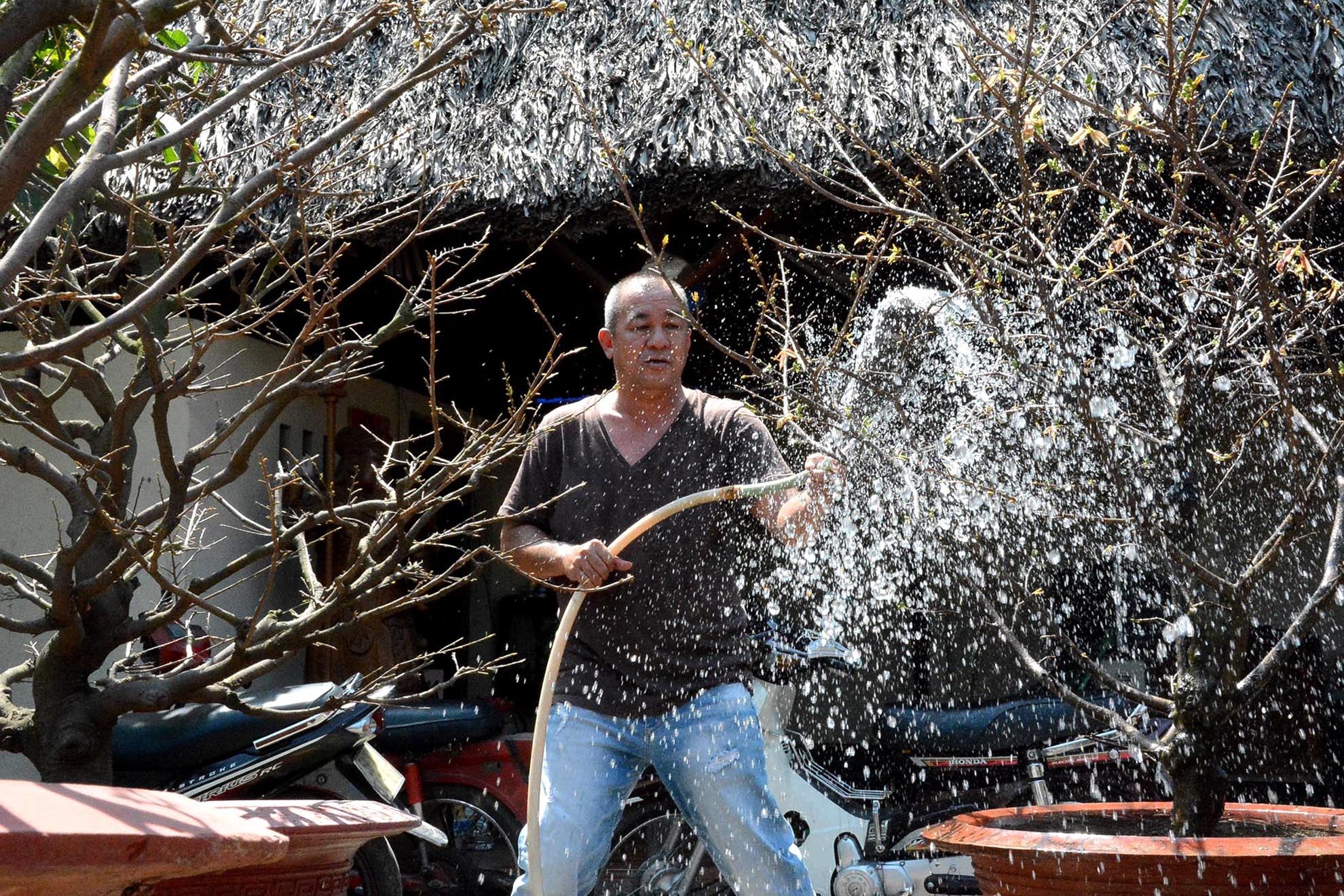 | Ông Hòa nhận định năm nay thời tiết thuận lợi nên tranh thủ những ngày này nhà vườn bắt đầu lặt lá để mai nở đúng Tết. |