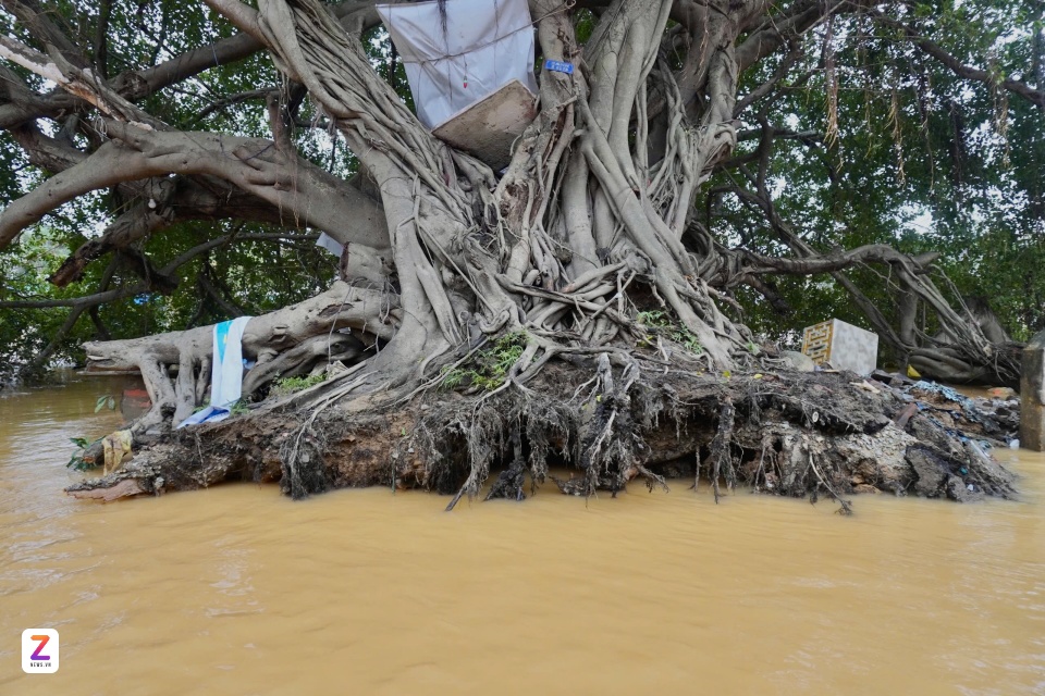 Cây sanh cho bóng mát, từng là "báu vật" của ngôi làng, gắn bó với bao thế hệ. Hiện, nước lũ ở mức cao gây khó khăn trong việc tiếp cận và công tác khắc phục.