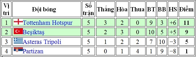 | Với chiến thắng này, đội bóng thành London chính thức giành vé đi tiếp với 11 điểm sau 5 lượt trận. Trong khi Partizan nói lời chia tay giải đấu do chỉ có được 1 điểm trong tay. |