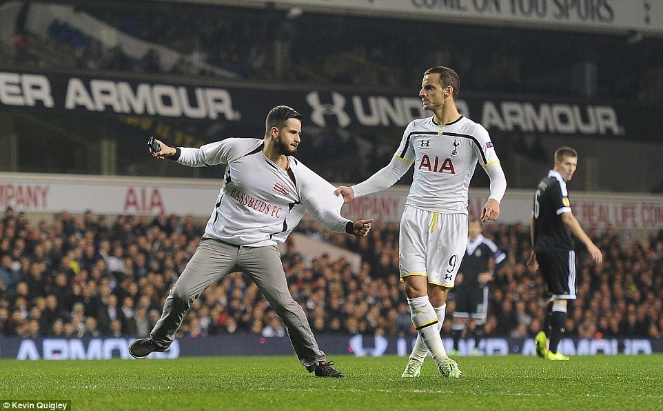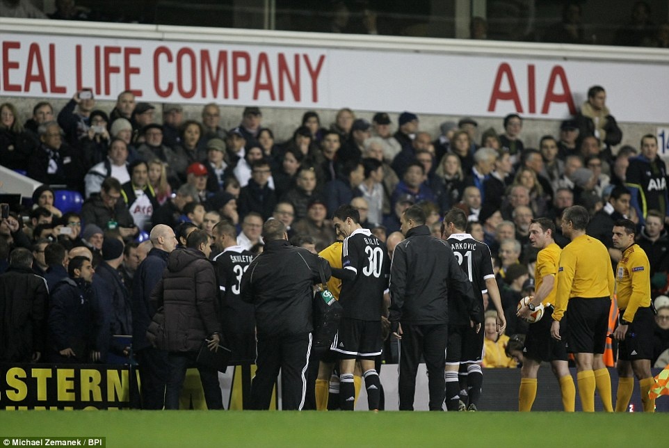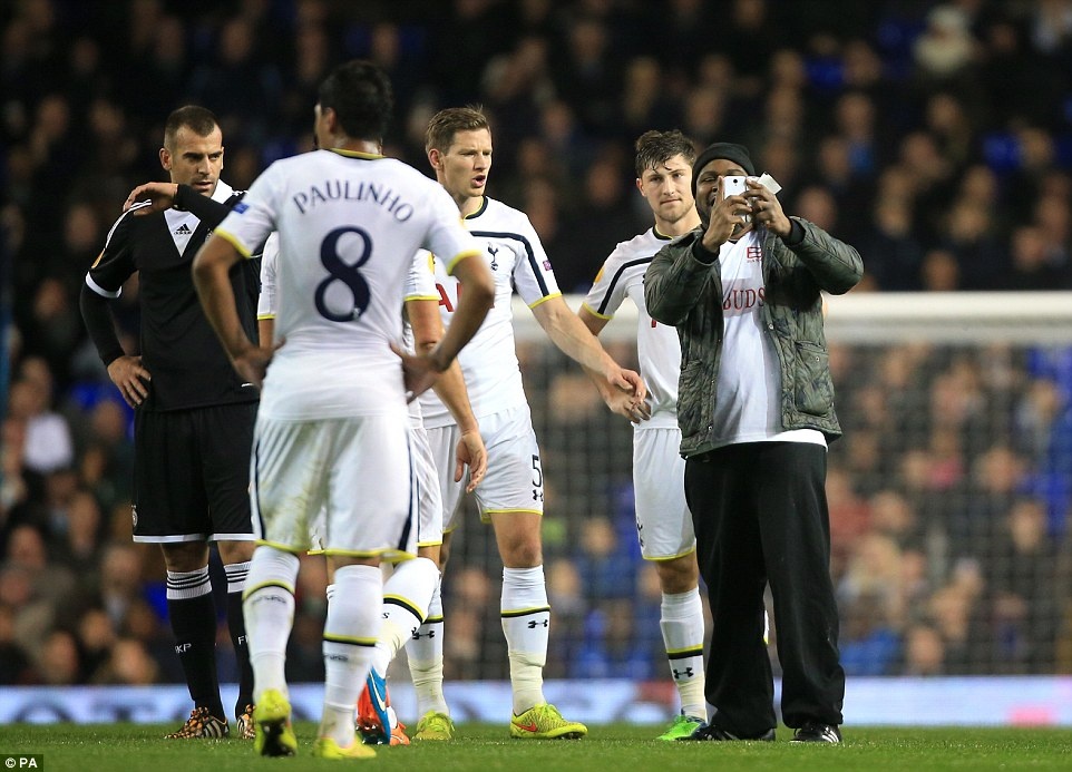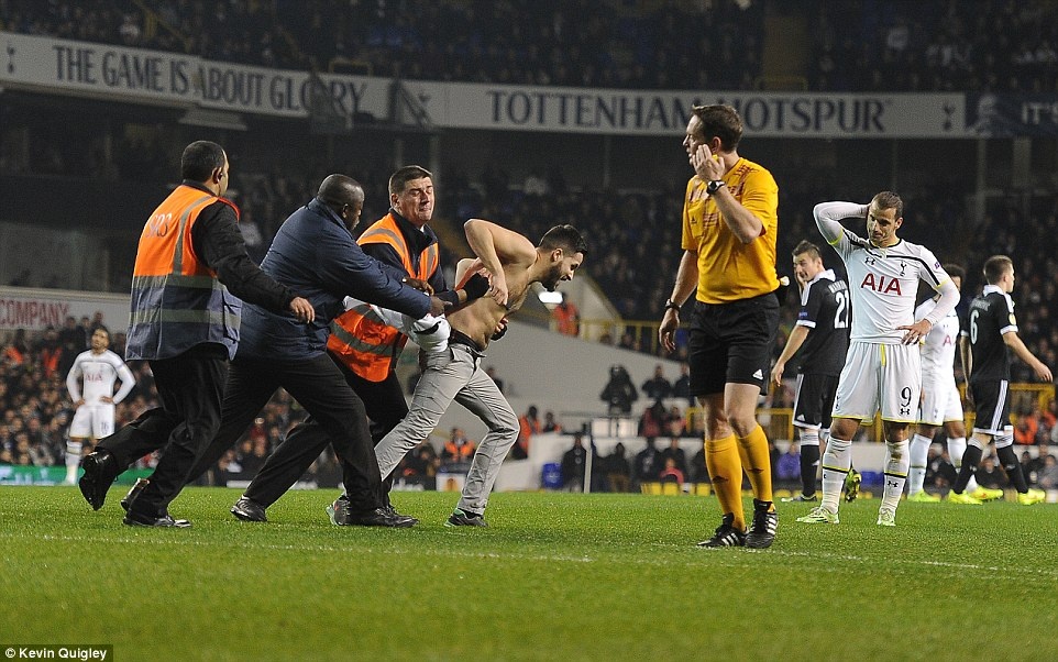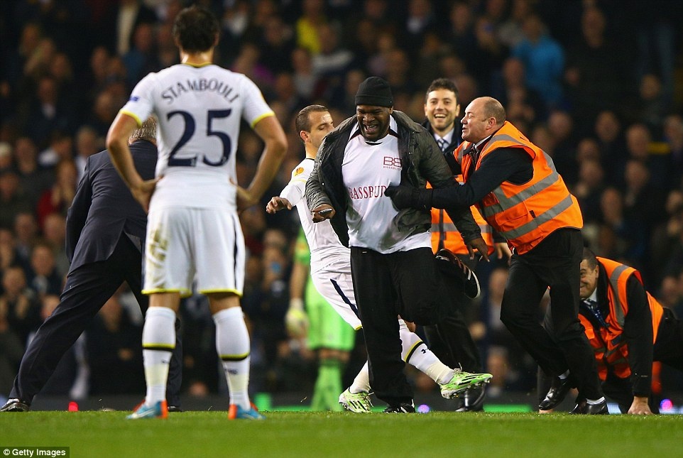 | Phút thứ 41, trọng tài người Ukraine Aranovskiy buộc phải cho dừng trận đấu khi 3 fan cuồng tràn xuống sân White Hart Lane khi Tottenham tiếp đón Partizan trong khuôn khổ lượt trận thứ 5 vòng bảng Europa League. |