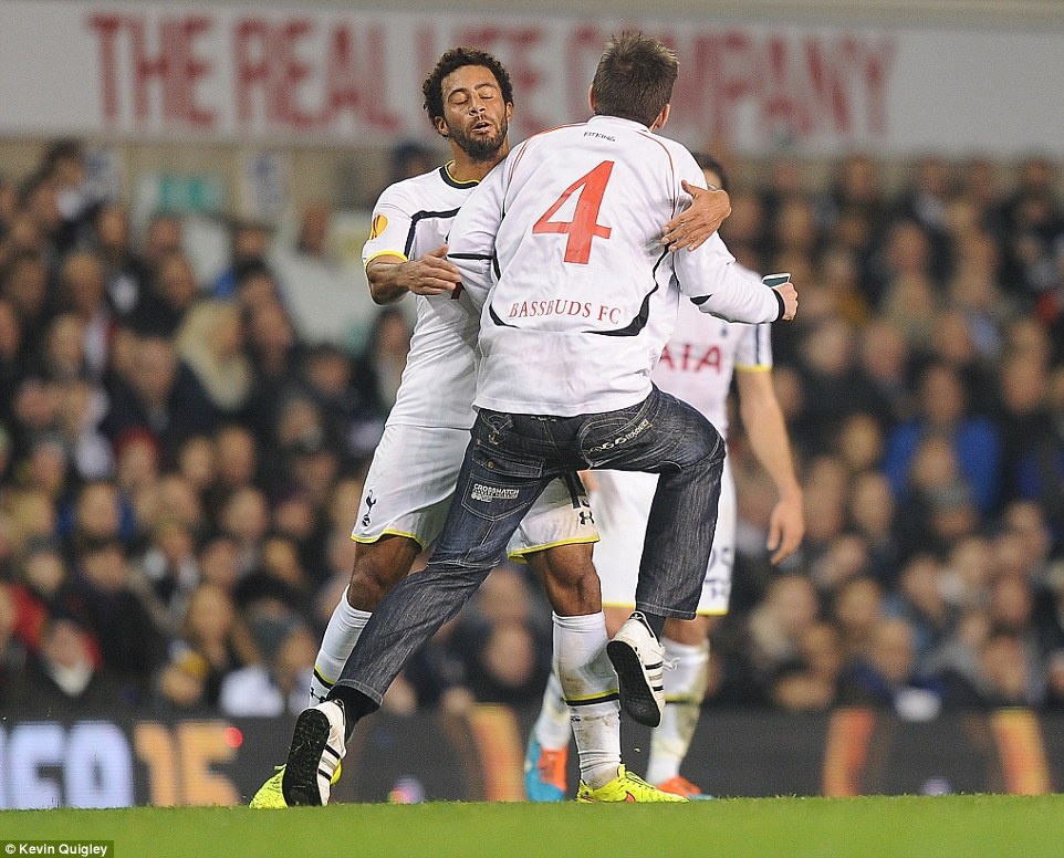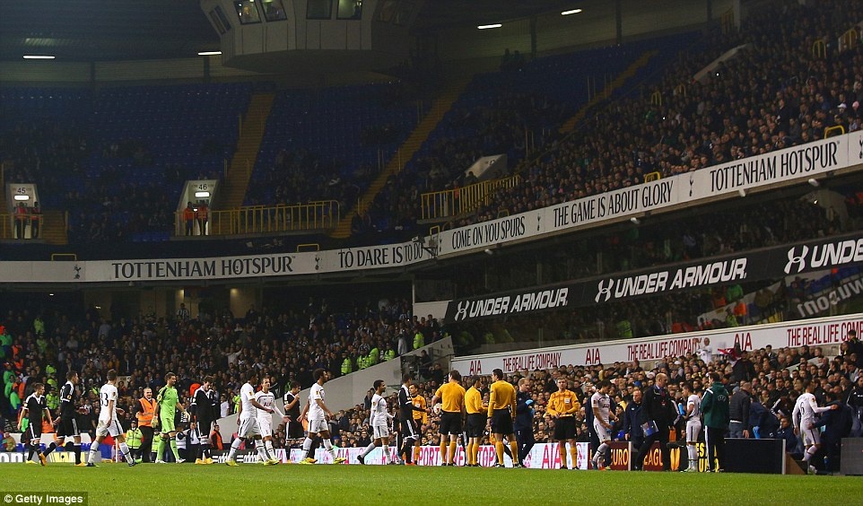 | Các cầu thủ Tottenham cố gắng ngăn cản những kẻ quá khích. |