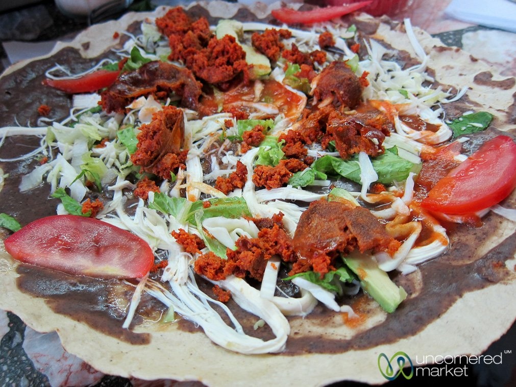 Mexico: Vùng Oaxaca của Mexico nổi tiếng với nền ẩm thực phong phú và độc đáo. Một trong các món ăn được nhiều du khách yêu thích là tlayuda - bánh mì dẹt với một lát thịt lợn thái mỏng, đậu chiên, khoai tây, bơ và một số loại thịt khác xé nhỏ. Ảnh: Uncornered Market. |