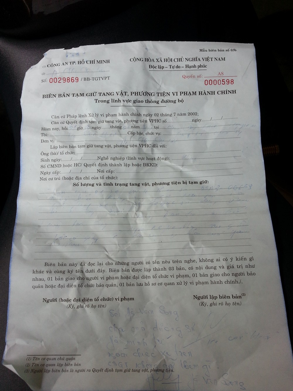 Về trụ sở CSGT Trí không ký vào biên bản vi phạm, không xuất trình được bằng lái A2, bảo hiểm xe và giấy CMND cá nhân mà chỉ xuất trình được giấy đăng ký xe mang tên ông Nguyễn Hoàng Hải (ngụ quận Phú Nhuận)