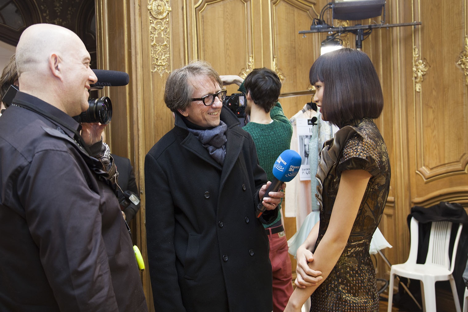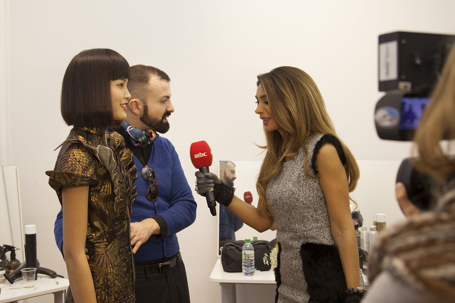 Phóng viên của đài MBC phỏng vấn NTK Julien Fournie, ông cũng giới thiệu Chà Mi là người mẫu đến từ Việt Nam.
