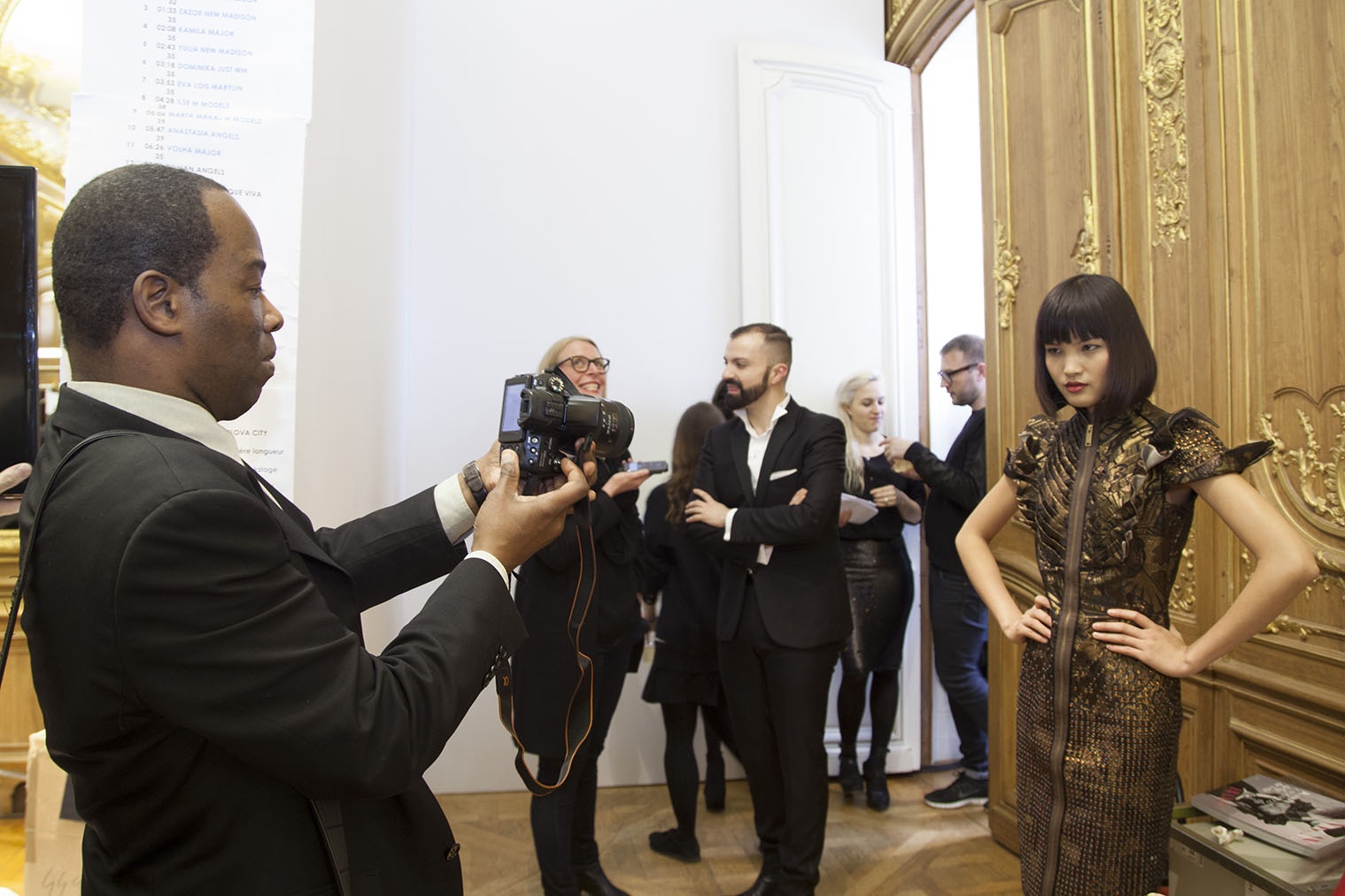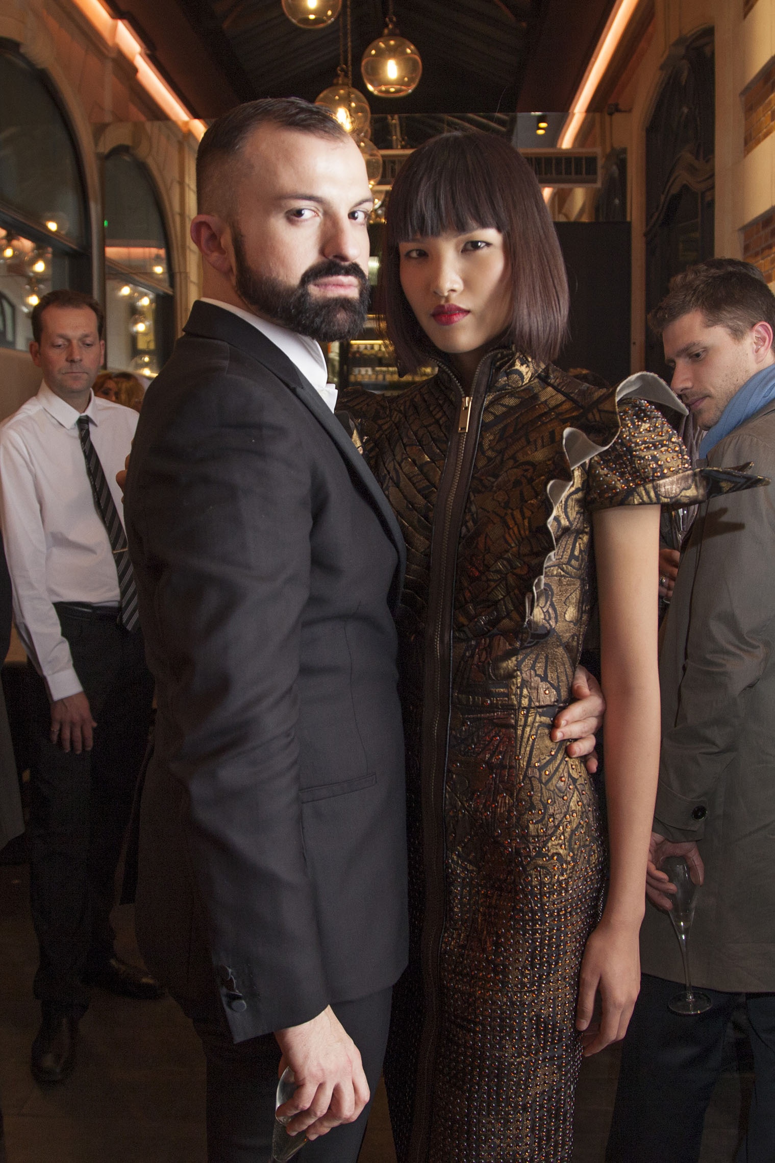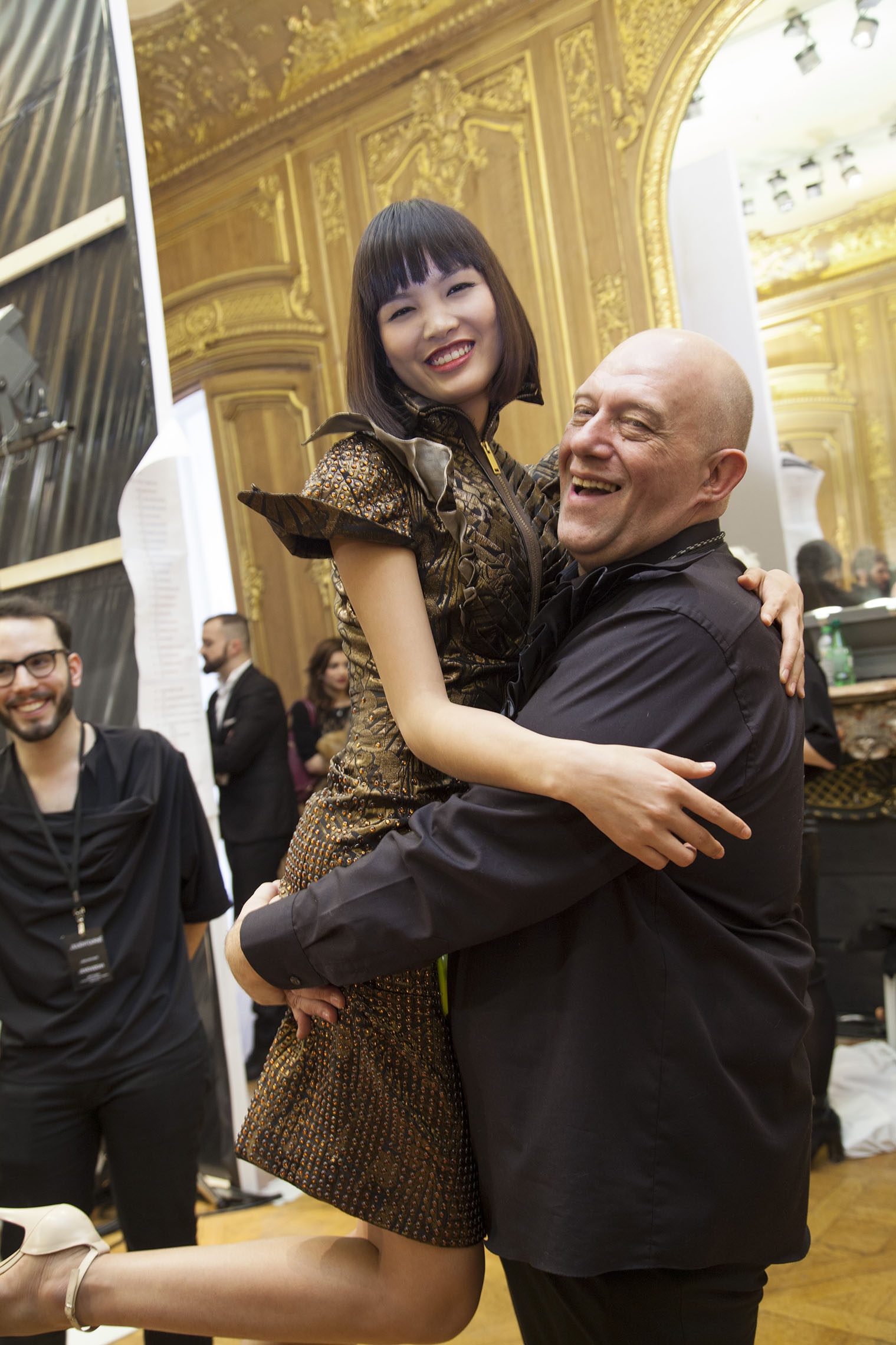 Chà Mi gặp gỡ NTK Julien Fournie trên thảm đỏ trước khi show diễn bắt đầu. Dù cô không chính thức bước lên sàn catwalk, NTK này vẫn dành cho nữ người mẫu đến từ Việt Nam những tình cảm thân thiết và sự hỗ trợ nhiệt tình.