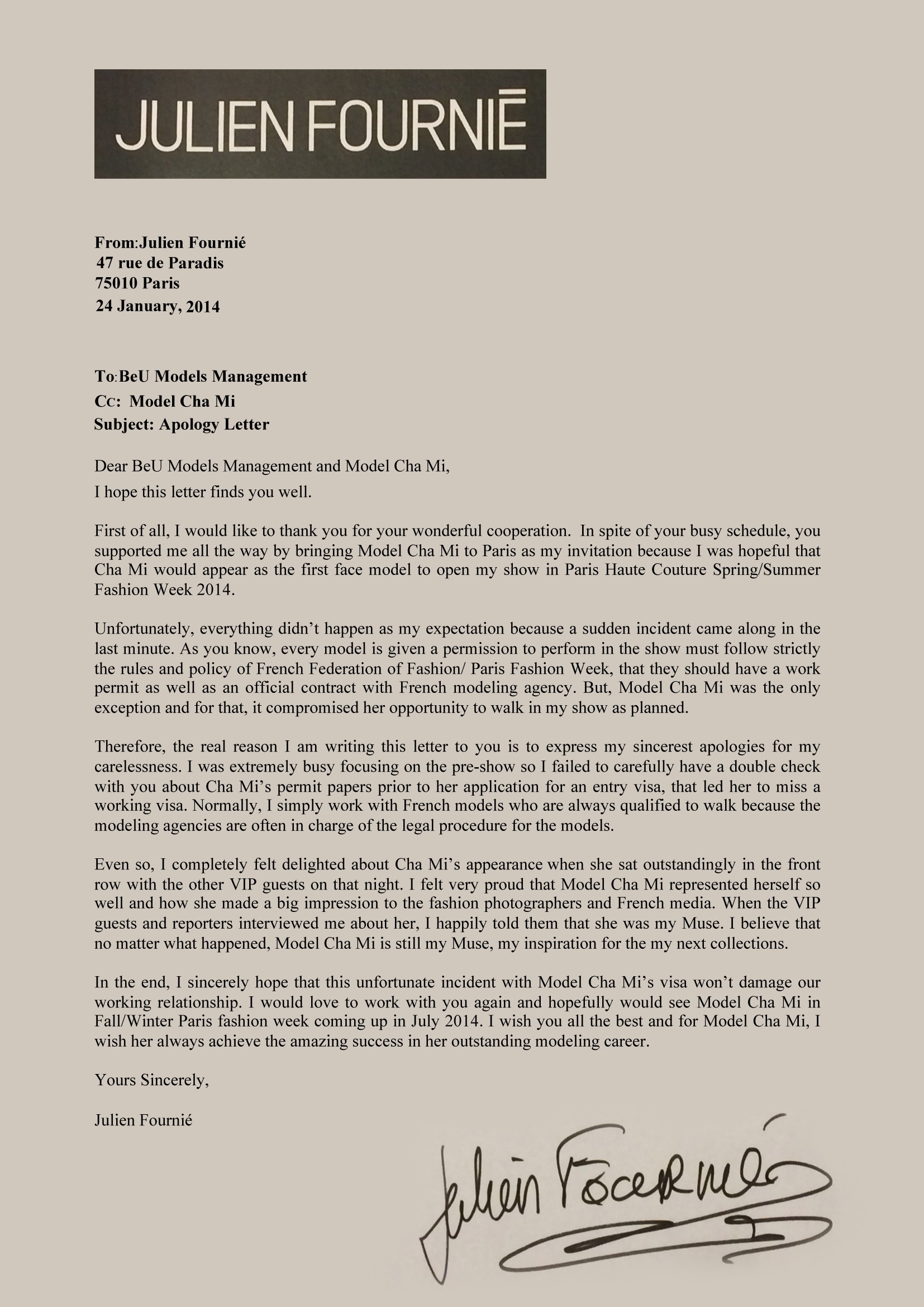 Mới đây, NTK Julien Fournie đã gửi bức thư xin lỗi Chà Mi vì sự cố đáng tiếc. Trong thư, ông thừa nhận sơ suất và tỏ ra tiếc nuối khi Chà Mi không thể trình diễn trong show diễn của mình. NTK cho biết, ông rất tự hào khi Chà Mi tạo được sức hút với giới truyền thông quốc tế. Bên cạnh đó, NTK ngỏ ý mong muốn Chà Mi trình diễn trong show thời trang tiếp theo của ông tại Paris Fashion Show vào tháng 7 tới.