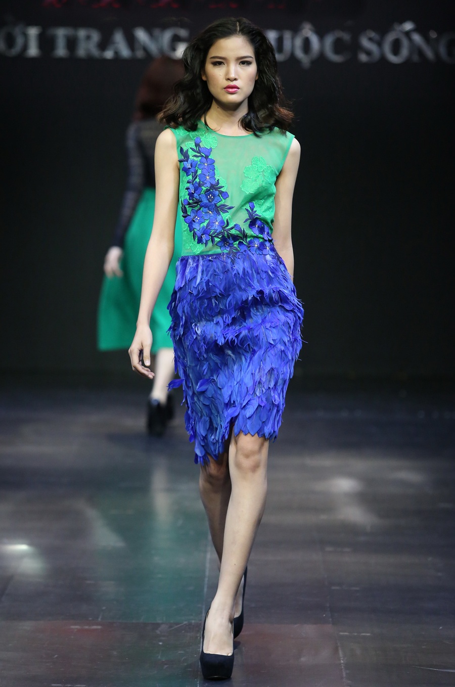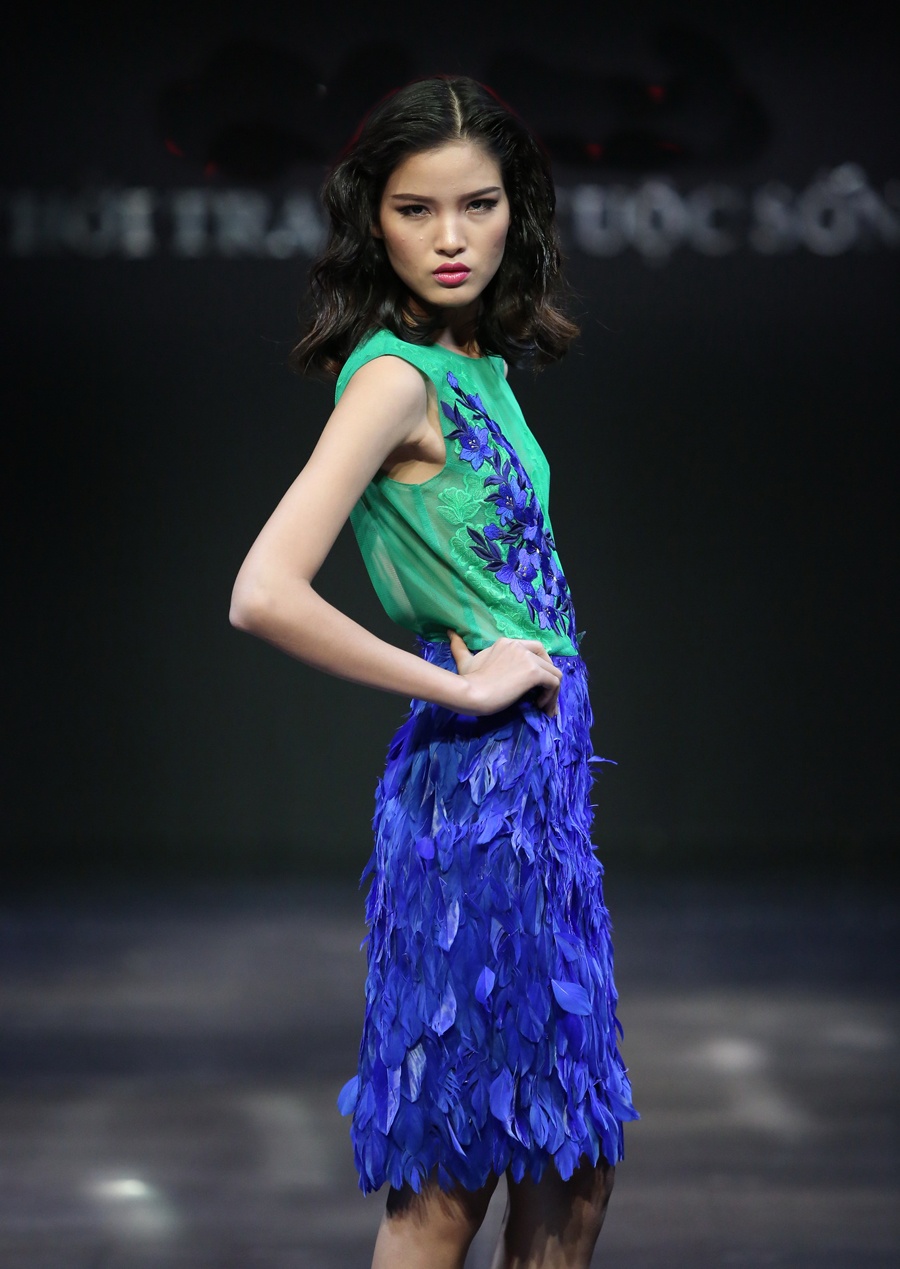 | Bộ sưu tập mùa hè của NTK Minh Tú chú trọng màu xanh lá, xanh da trời tươi mát, phù hợp xu hướng thế giới và không gian mùa hè cận kề. Trong ảnh, chân dài sinh năm 1992 tự tin thể hiện bộ váy đính lông vũ sang trọng, sành điệu. |