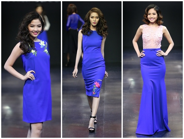 | Các chân dài tươi tắn khi thể hiện bộ sưu tập có gam màu xanh tươi mát làm chủ đạo. |