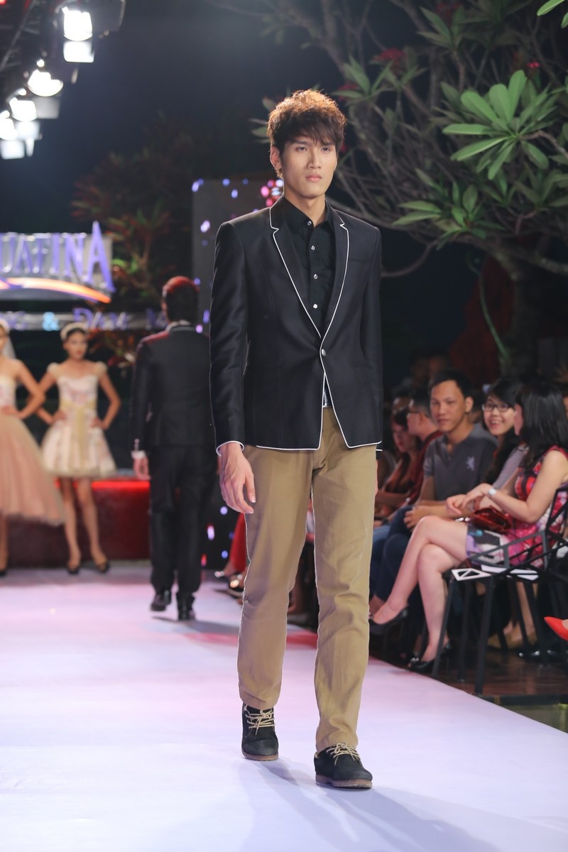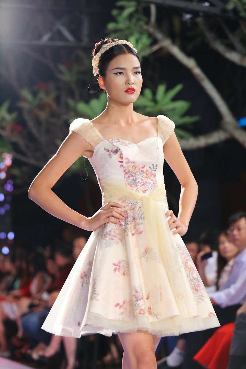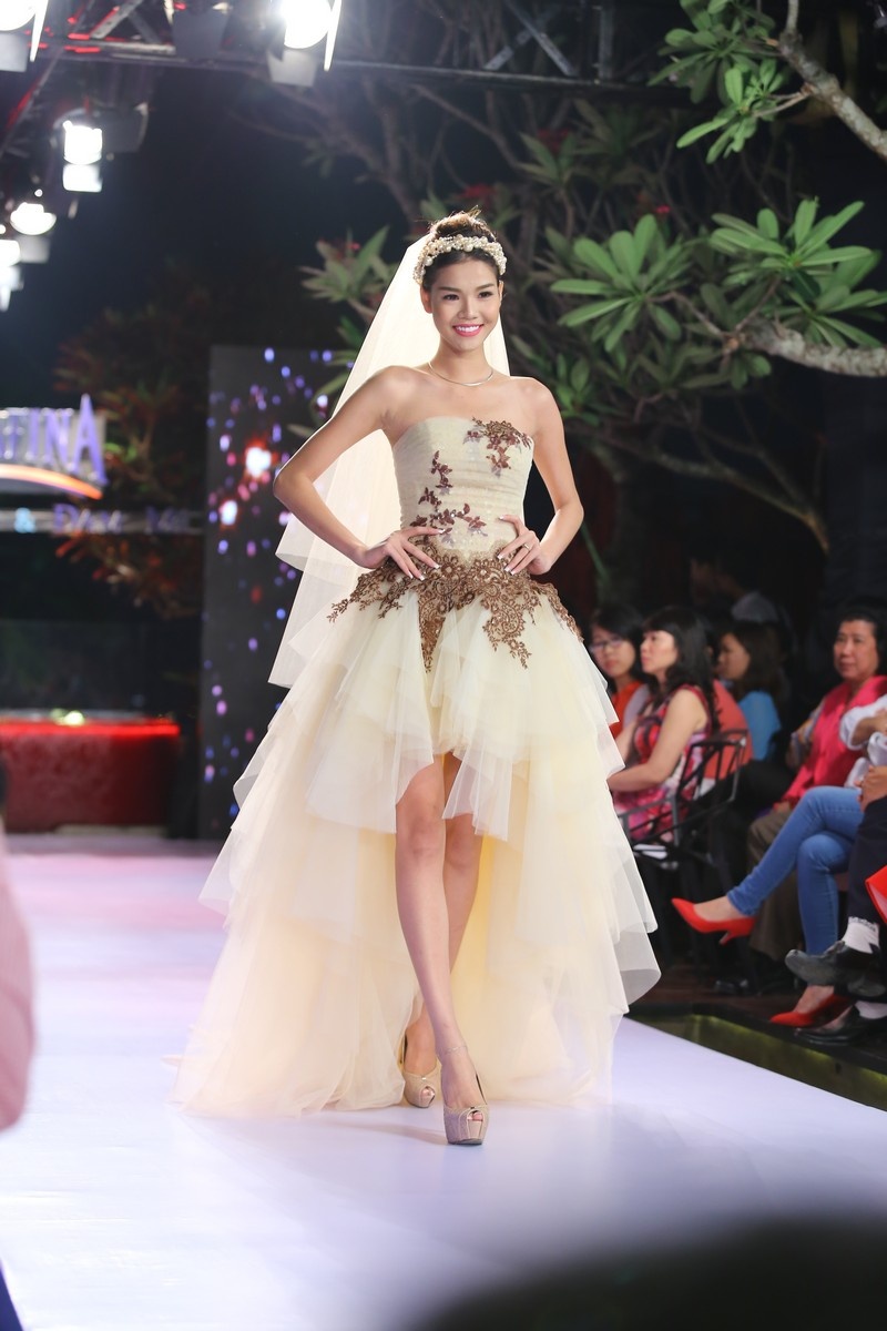 Người mẫu trưởng thành hơn sau ''Vietnam's Next Top Model'', cô sải bước tự tin cạnh các đồng nghiệp Văn Kiên, Anh Quân, Tuấn Việt, Mâu Thủy.