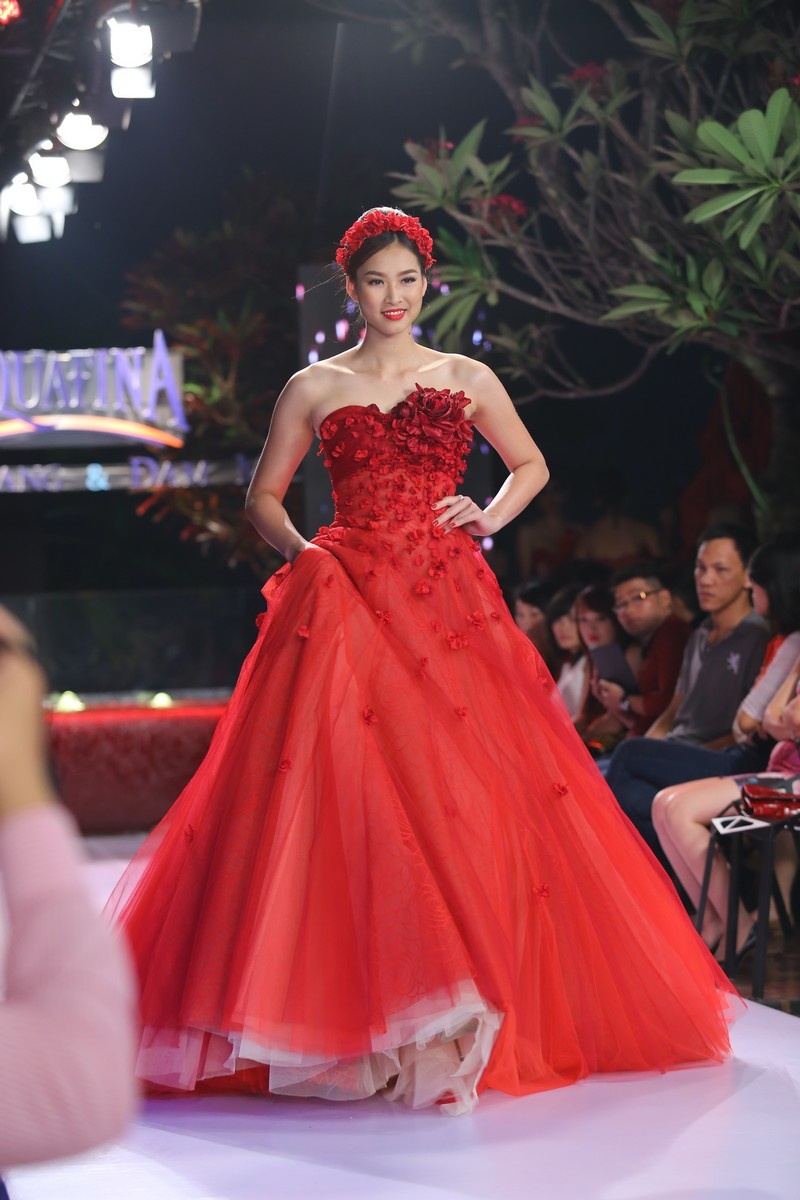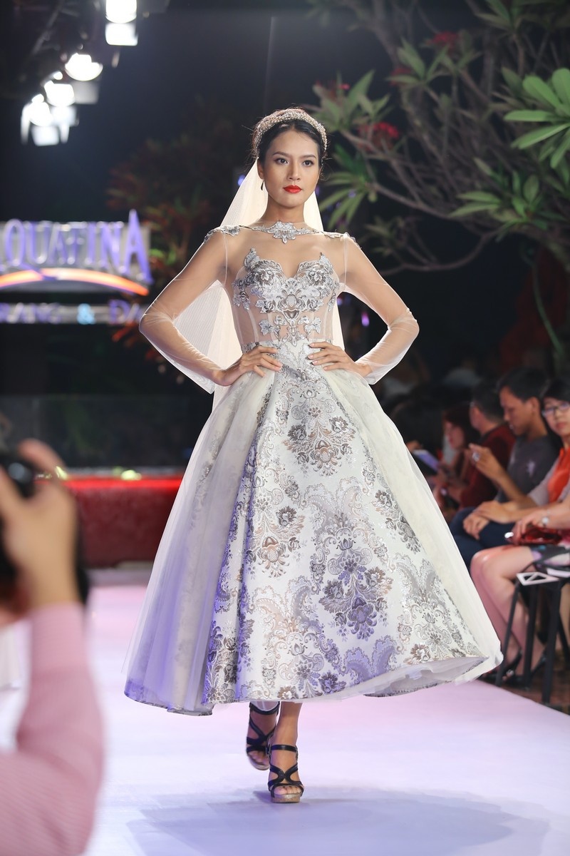 Mâu Thanh Thủy tự tin với phần catwalk của mình. Đồng hành cùng các đàn chị của mùa trước, nữ người mẫu không hề thua kém về thần thái và cách phiêu theo nhạc, trình diễn bộ trang phục đúng ý tưởng.