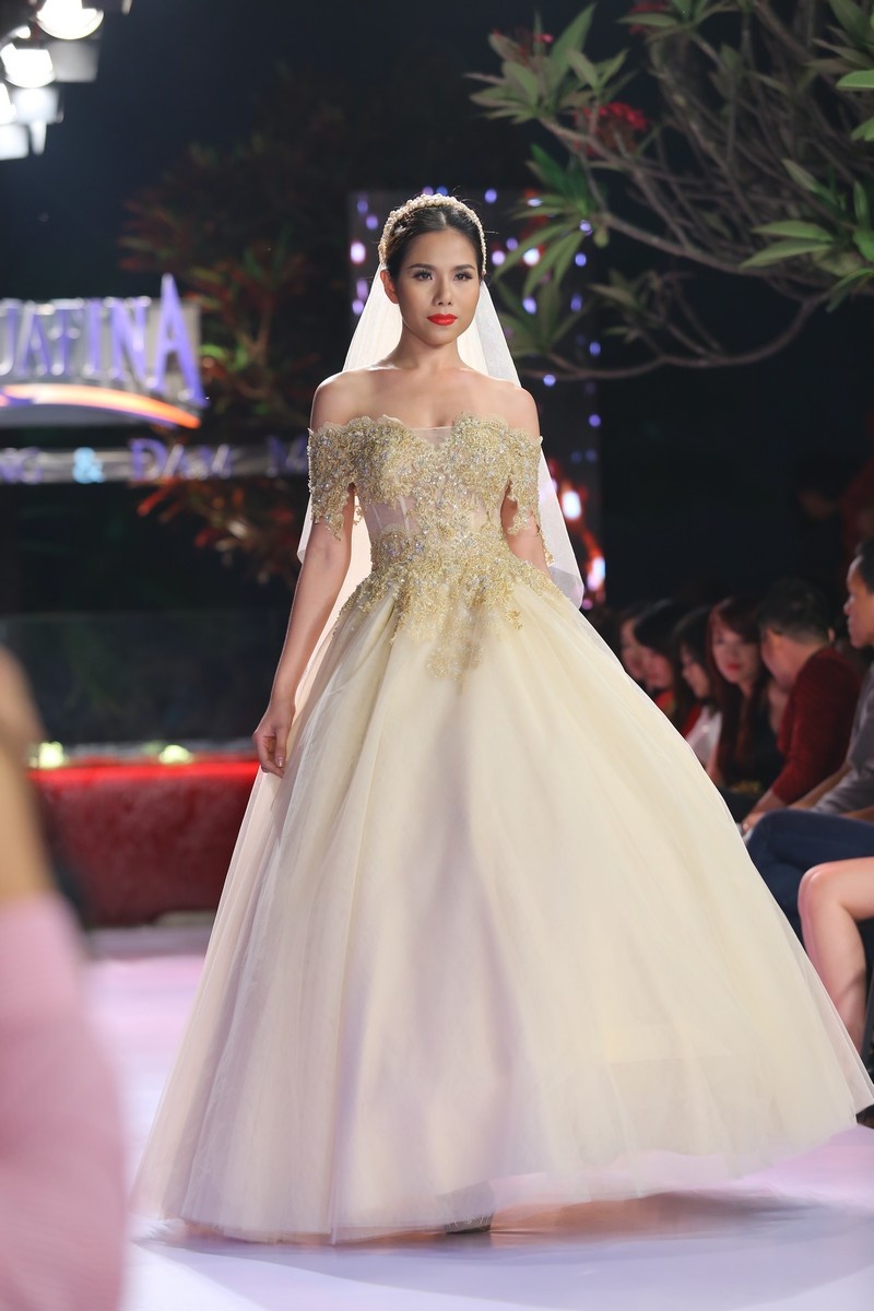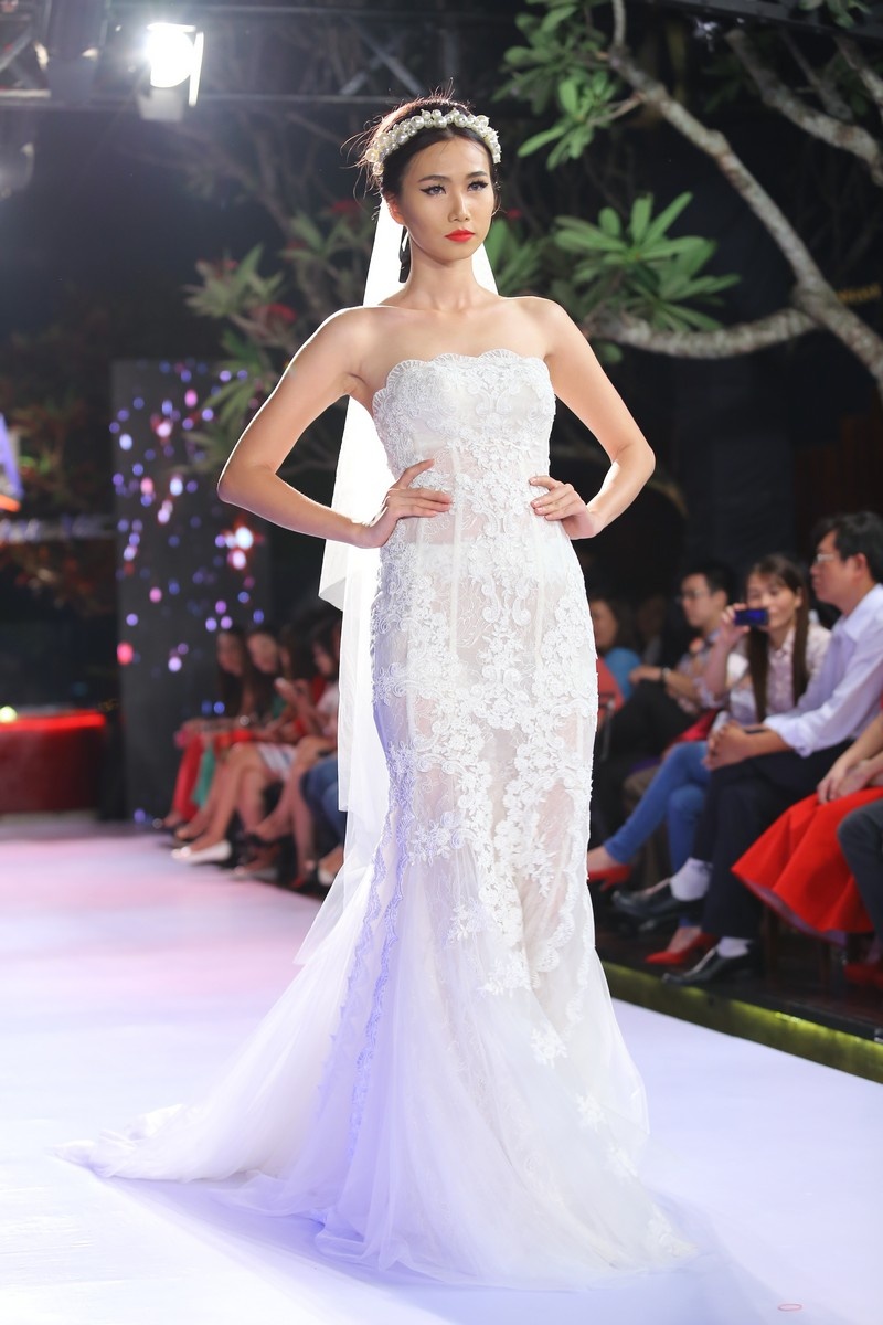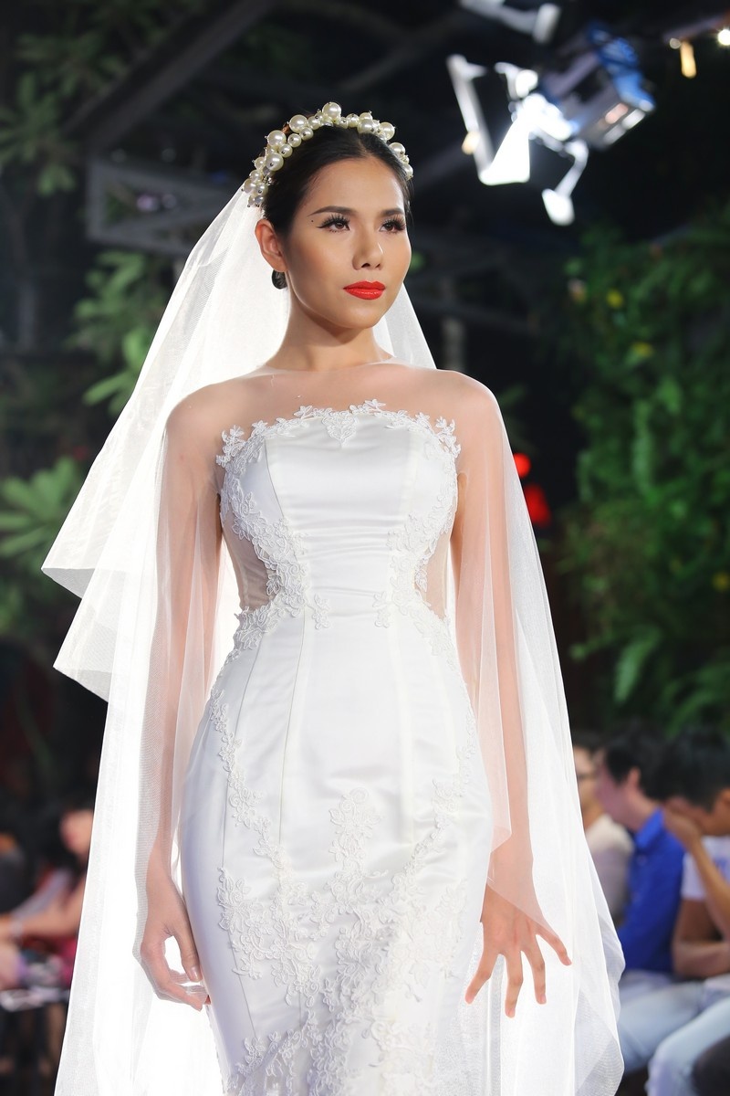 Á quân Trà My ấn tượng trên sàn diễn với mẫu váy cưới hiện đại.