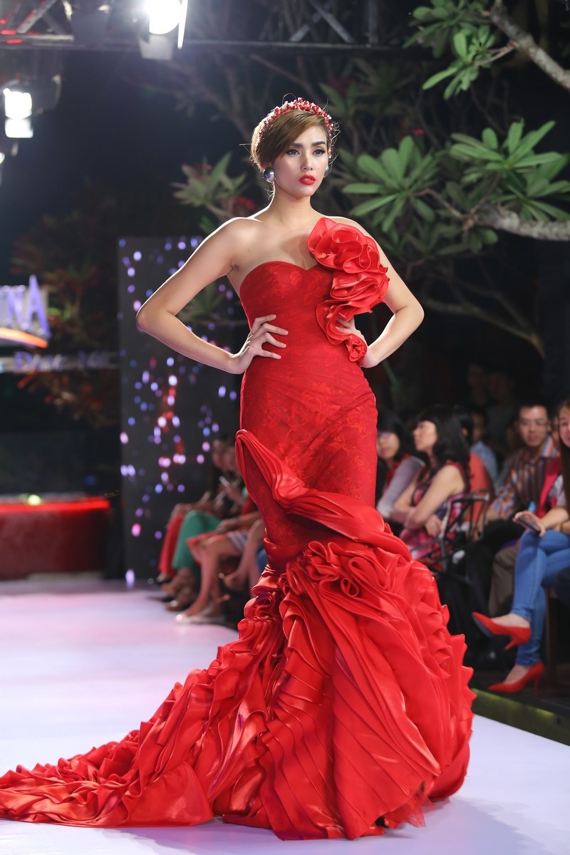 Trang Trần xuất hiện trên sàn diễn với mái tóc tém ngắn nhuộm đỏ ấn tượng, cô trình diễn một thiết kế ôm sát quyến rũ.