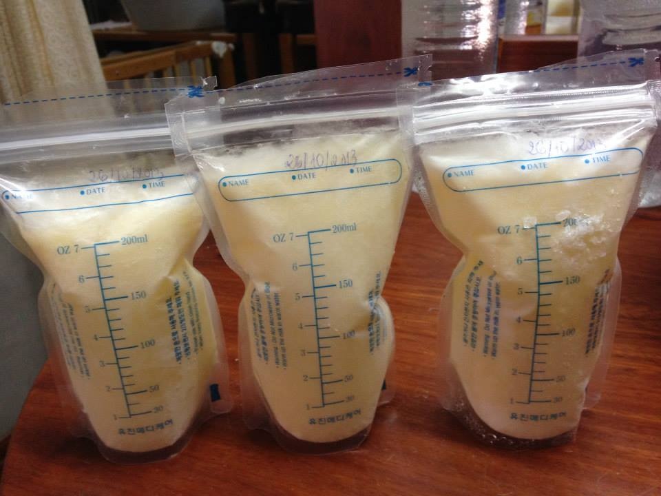 Trong một ngày, nếu hút được hơn 6 bình hoặc bé không bú hết lượng sữa đã hút, Hà dồn vào bình to hoặc túi trữ sữa, ghi ngày tháng năm và cho vào tủ đông lạnh. Do sữa để ngăn mát có hạn sử dụng 48 tiếng nên có thể hai ngày, Hà mới dồn sữa, ghi hạn sử dụng và cho vào ngăn đông một lần.