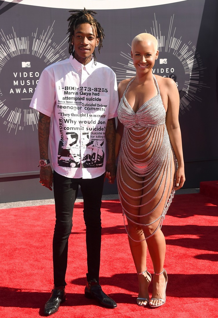 | Ngày 24/8 (giờ địa phương), cô nàng Amber Rose gây sốc với bộ váy bằng dây xích khi xuất hiện cùng chồng là rapper Wiz Khalifa. |
