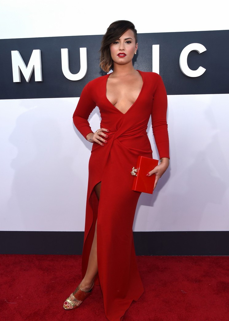 | Demi Lovato cũng gây chú ý với bộ đầm đỏ khoe vòng 1. |