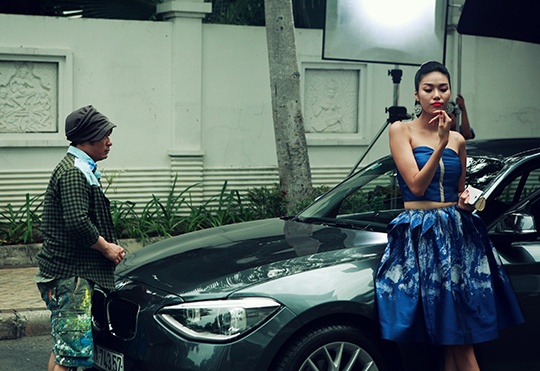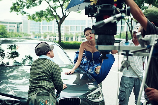 | Nam ca sĩ và chân dài Lan Khuê bàn bạc cùng đạo diễn trước mỗi cảnh quay. |