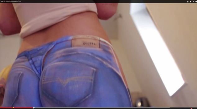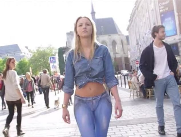 Nếu thoạt nhìn, ai cũng nghĩ người mẫu có tên Marie đang mặc chiếc quần bò bình thường như bao người khác. Tuy nhiên, khi nhìn kỹ, nhiều người sẽ sốc khi nhận ra, đó là chiếc quần được vẽ theo nghệ thuật body-painting.